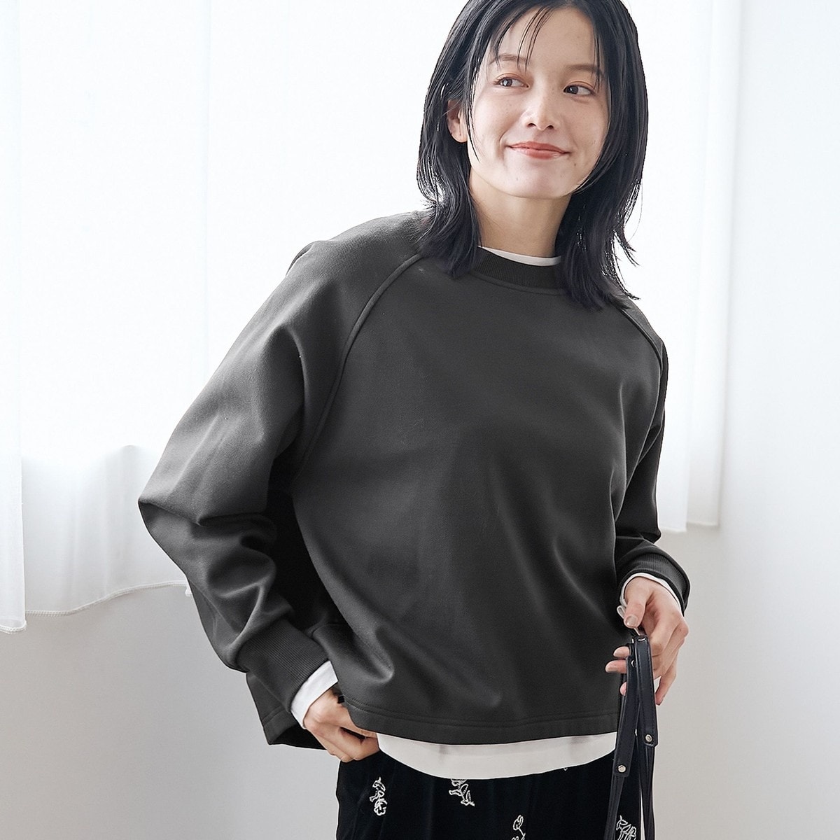 〇ラグラン袖と後ろ下がりシルエットで抜け感と動きやすさを両立