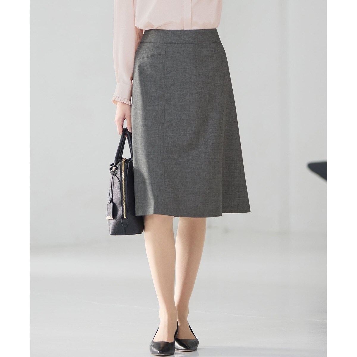 23区の定番として愛される、美しいフレアシルエットが魅力のスカートです。裾に向かってしなやかに広がるラインは、気になる脚のラインを拾いすぎず、どなたにも上品に着こなしていただけます。同素材のジャケットと合わせれば、洗練されたセットアップスタイルが完成。単品使いでも、ブラウスやきれいめのニットと相性抜群で、シーズンを問わずオフィスで着用いただけます。短すぎない丈感は、座った時にも膝が隠れる上品さをキープし、あらゆるシーンで安心感を与えます。 セレモニーシーンにもおすすめです。カラーは、着回し力抜群のベーシックなブラック(#005)、濃紺寄りの深いネイビーストライプ(#175)、洗練された都会的な雰囲気を醸し出すグレー(#004)の3色展開です。