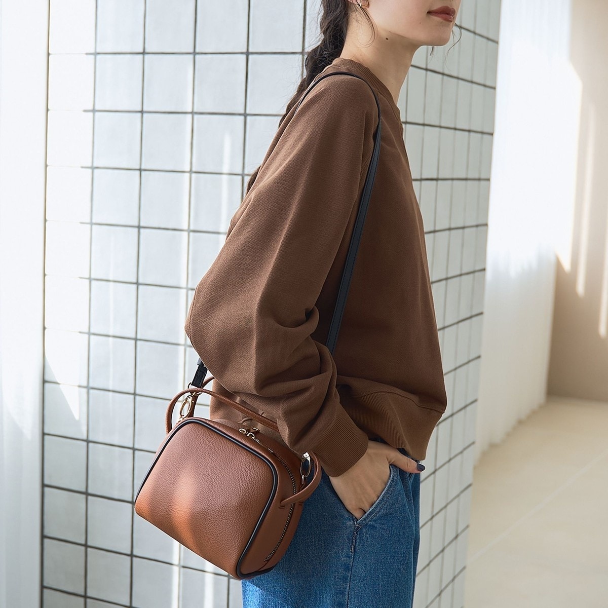 ショルダーにもハンドにも、使い勝手抜群のスクエアバッグ。