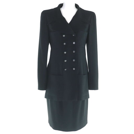 極美品★CHANEL BOUTIQUE シャネルブティック ヴィンテージ ウール100% 90年代 金ボタン付 ノーカラー フロントオープン ツイードジャケット+スカート スーツ ネイビー 36 フランス製 正規品 レディース【中古】