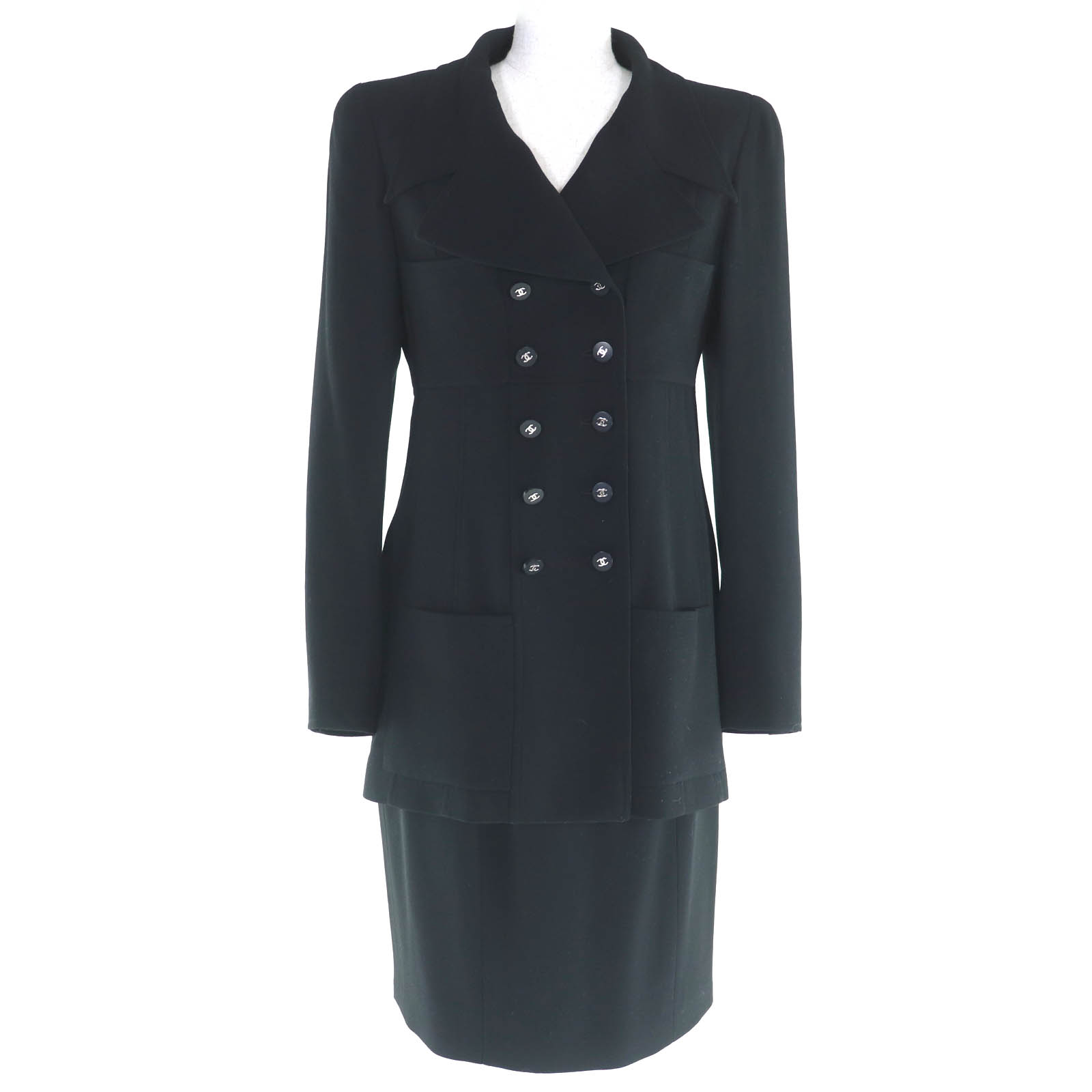 極美品◇CHANEL BOUTIQUE シャネルブティック ヴィンテージ ウール 裏地ロゴ総柄 ココマーク金ボタン付 ジャケット スカート セットアップ スーツ ブラック ゴールド金具 44 フランス製 レディース【中古】