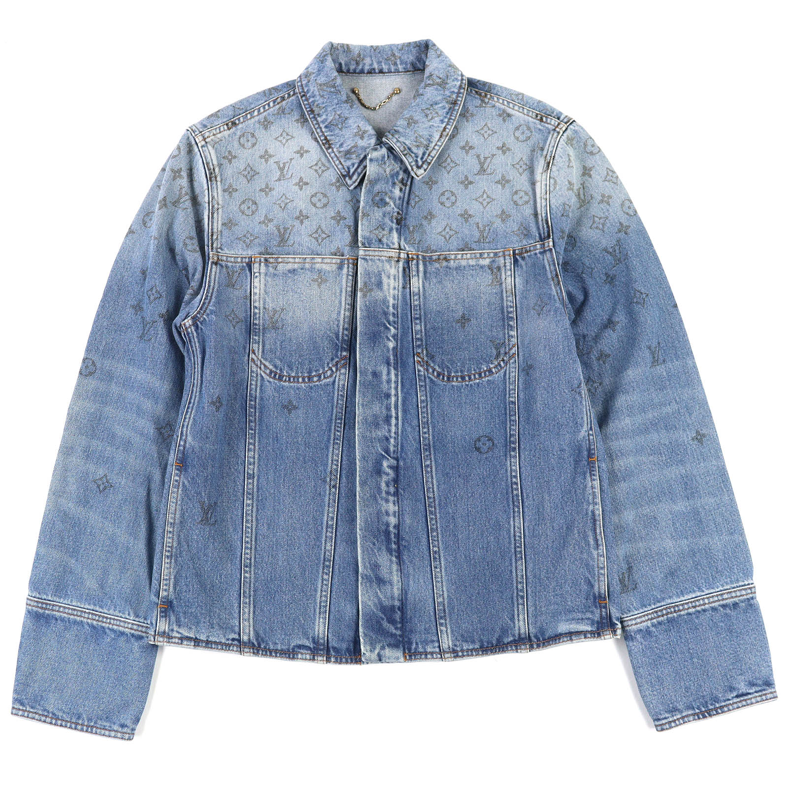 極美品☆LOUIS VUITTON ルイヴィトン レザーパイピング モノグラムフリンジ ノーカラーコート ホワイト インディゴ 34 イタリア製 正規品 レディース【中古】
