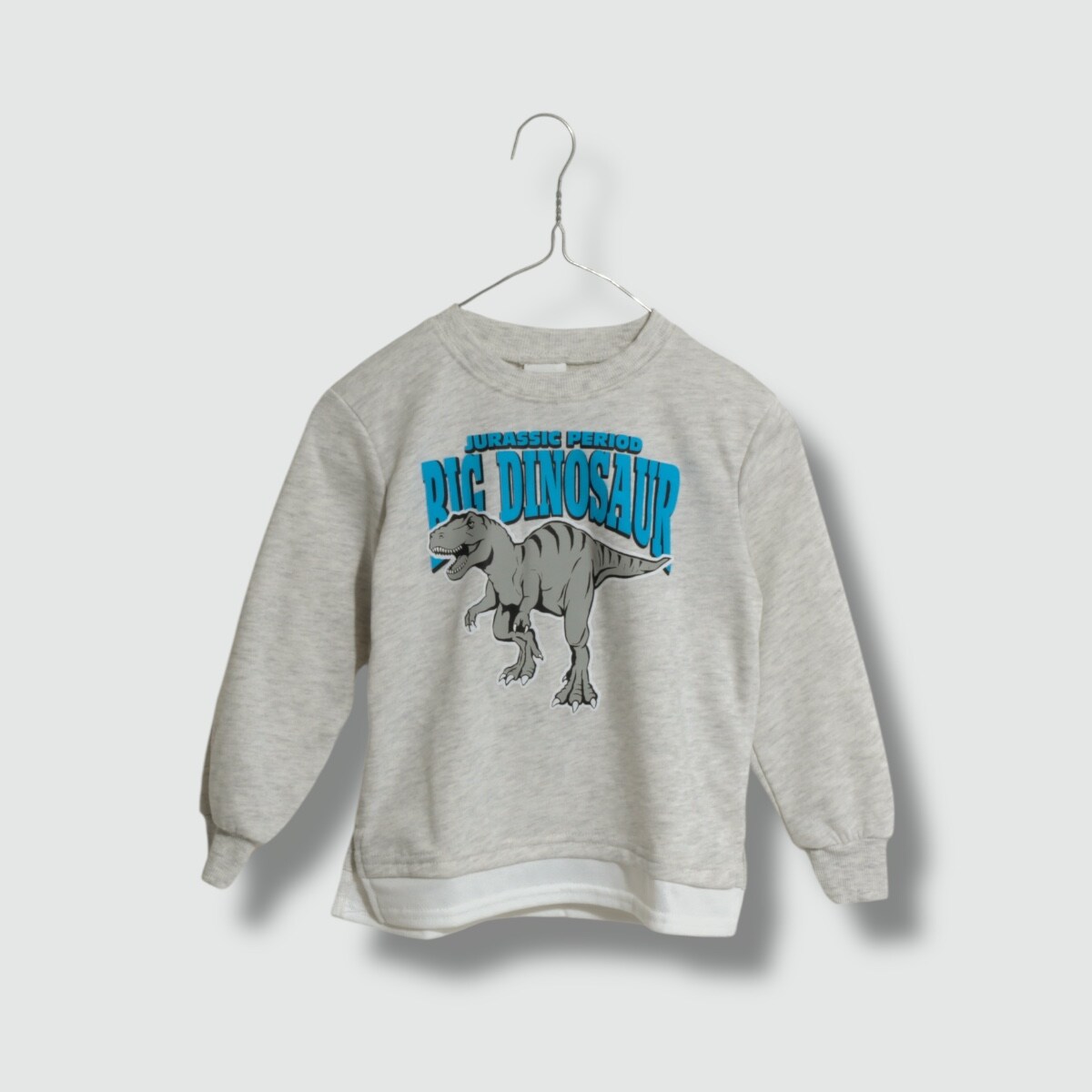 恐竜のグラフィックが印象的な薄手裏毛(起毛なし)のトレーナー。