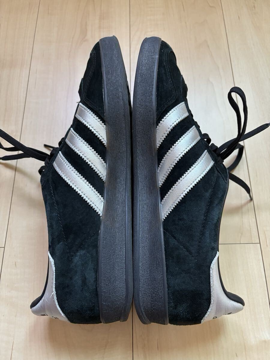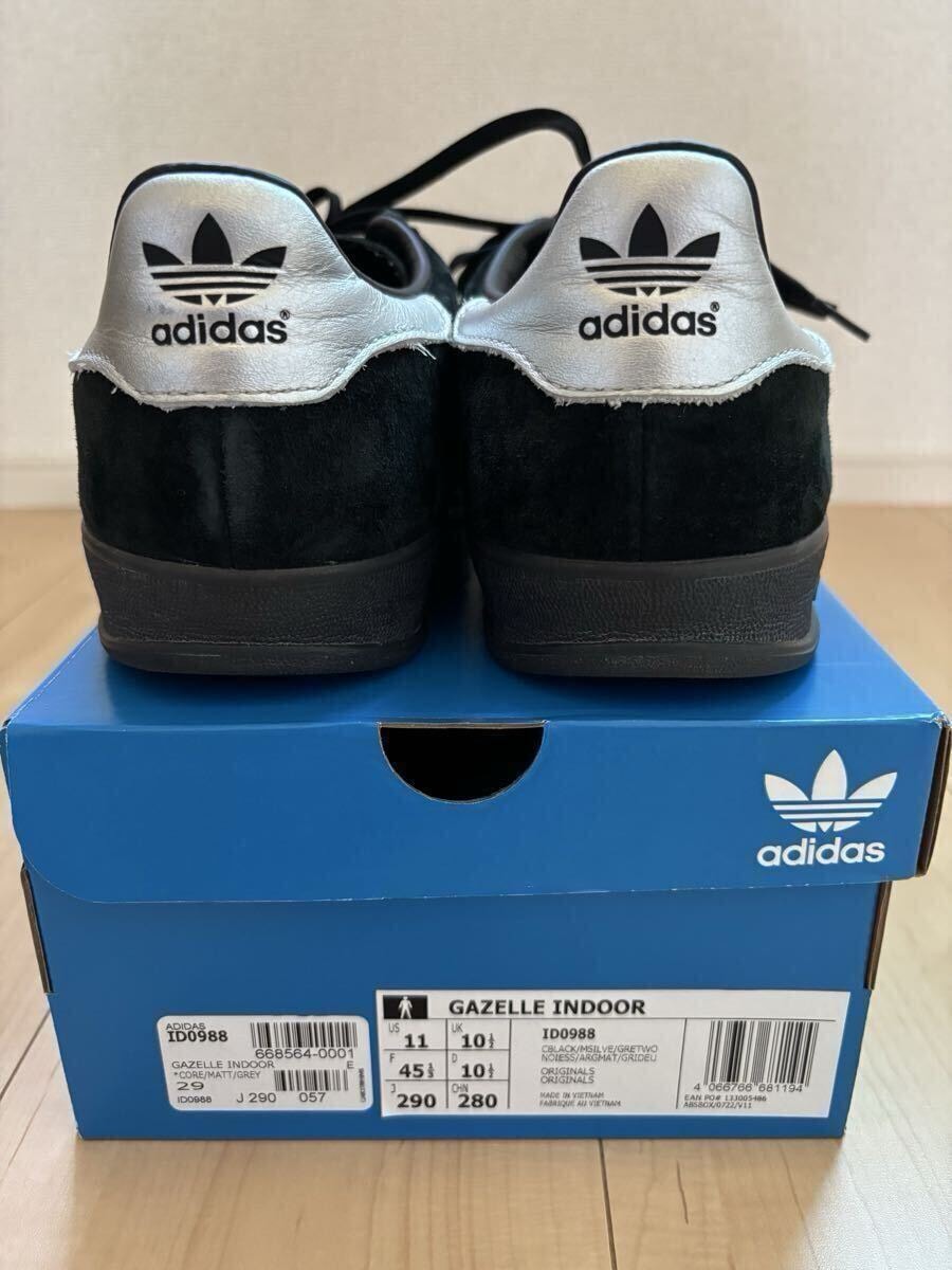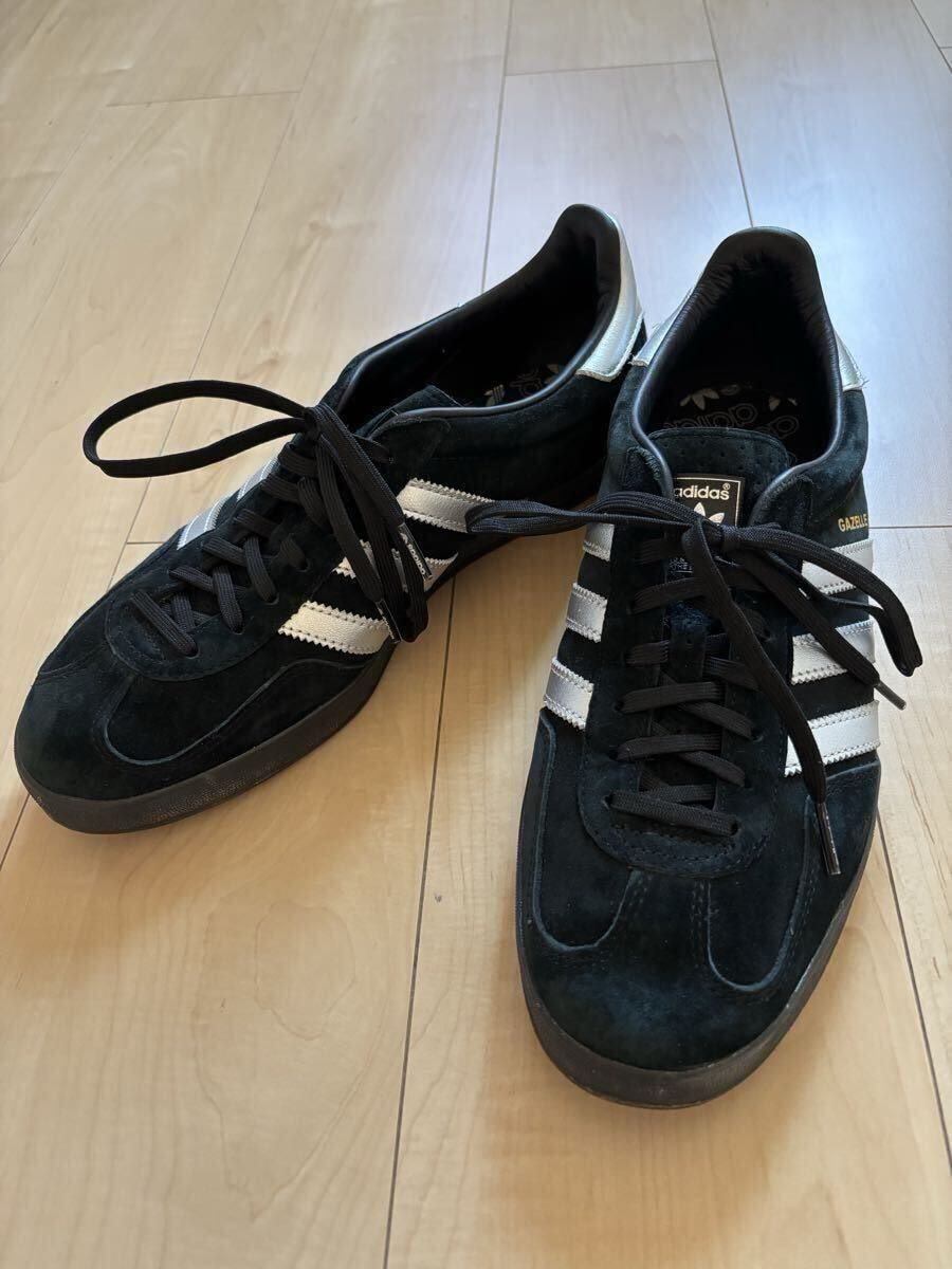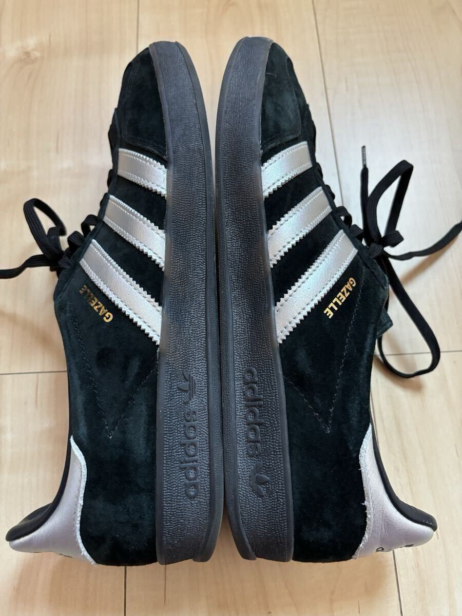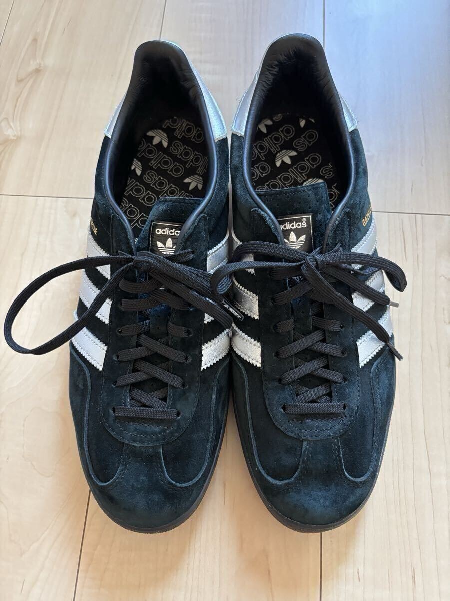 スエード素材のブラック/シルバーのadidas Gazelle indoorスニーカー、ラバーソールで快適な履き心地。