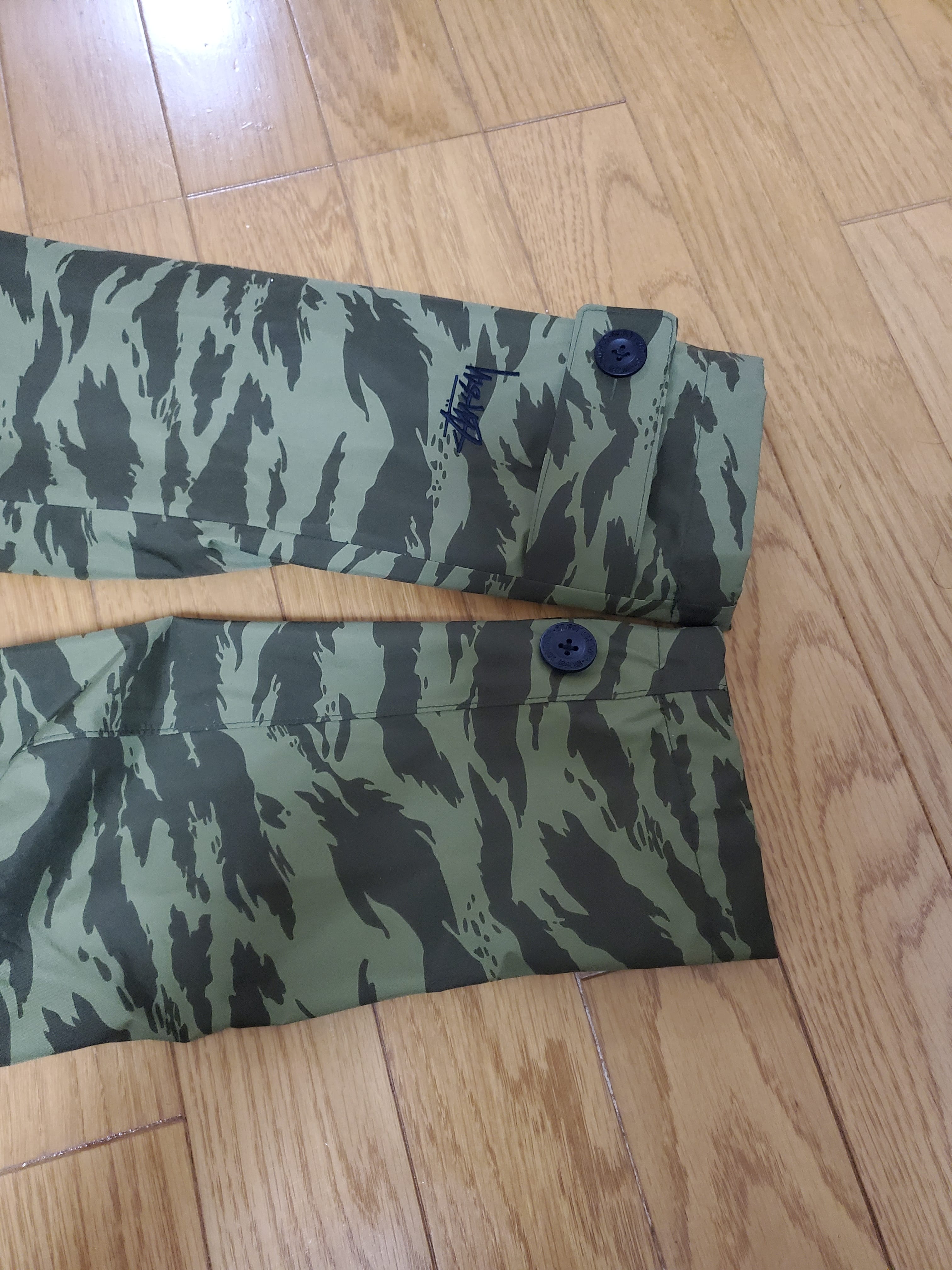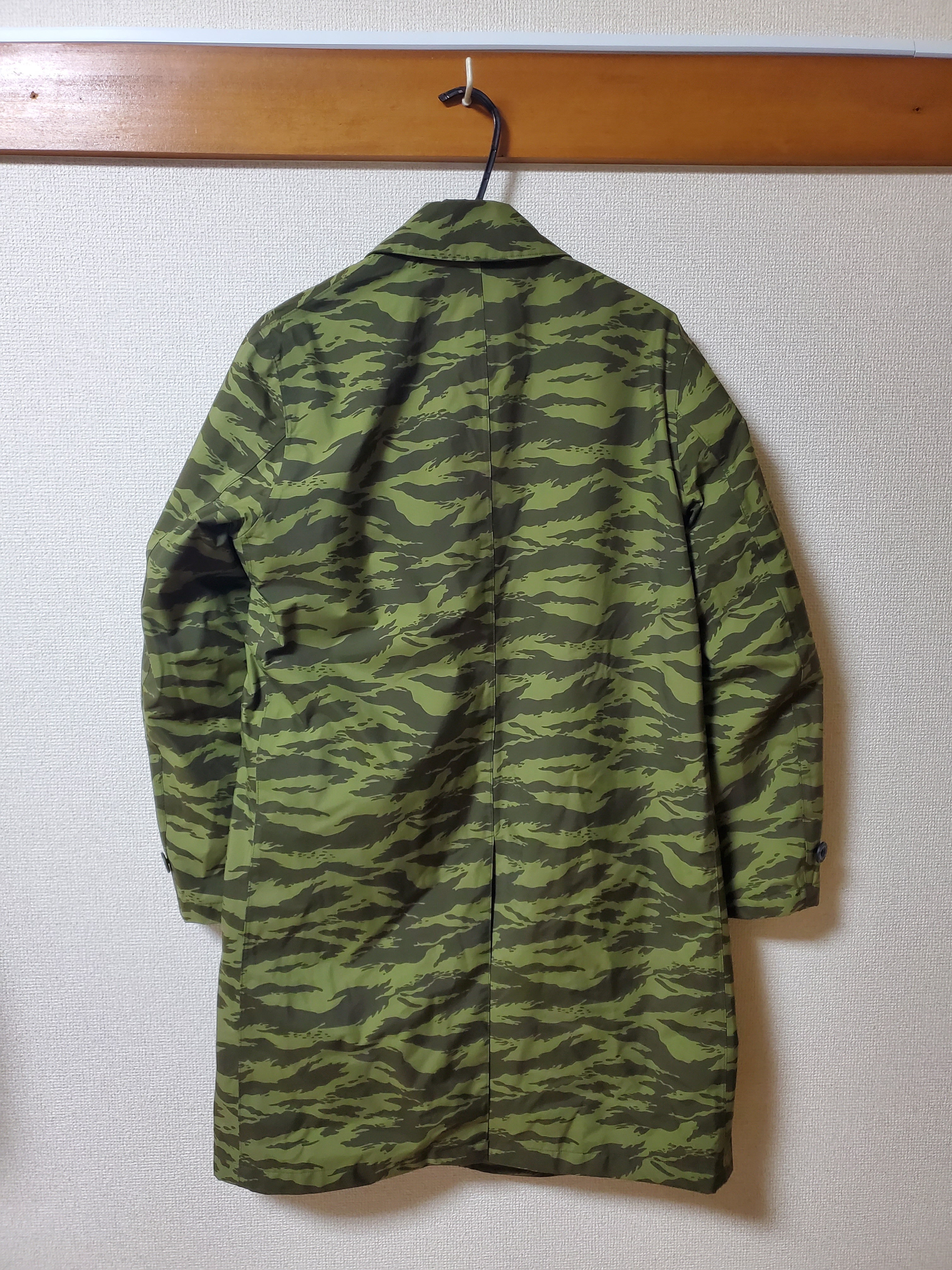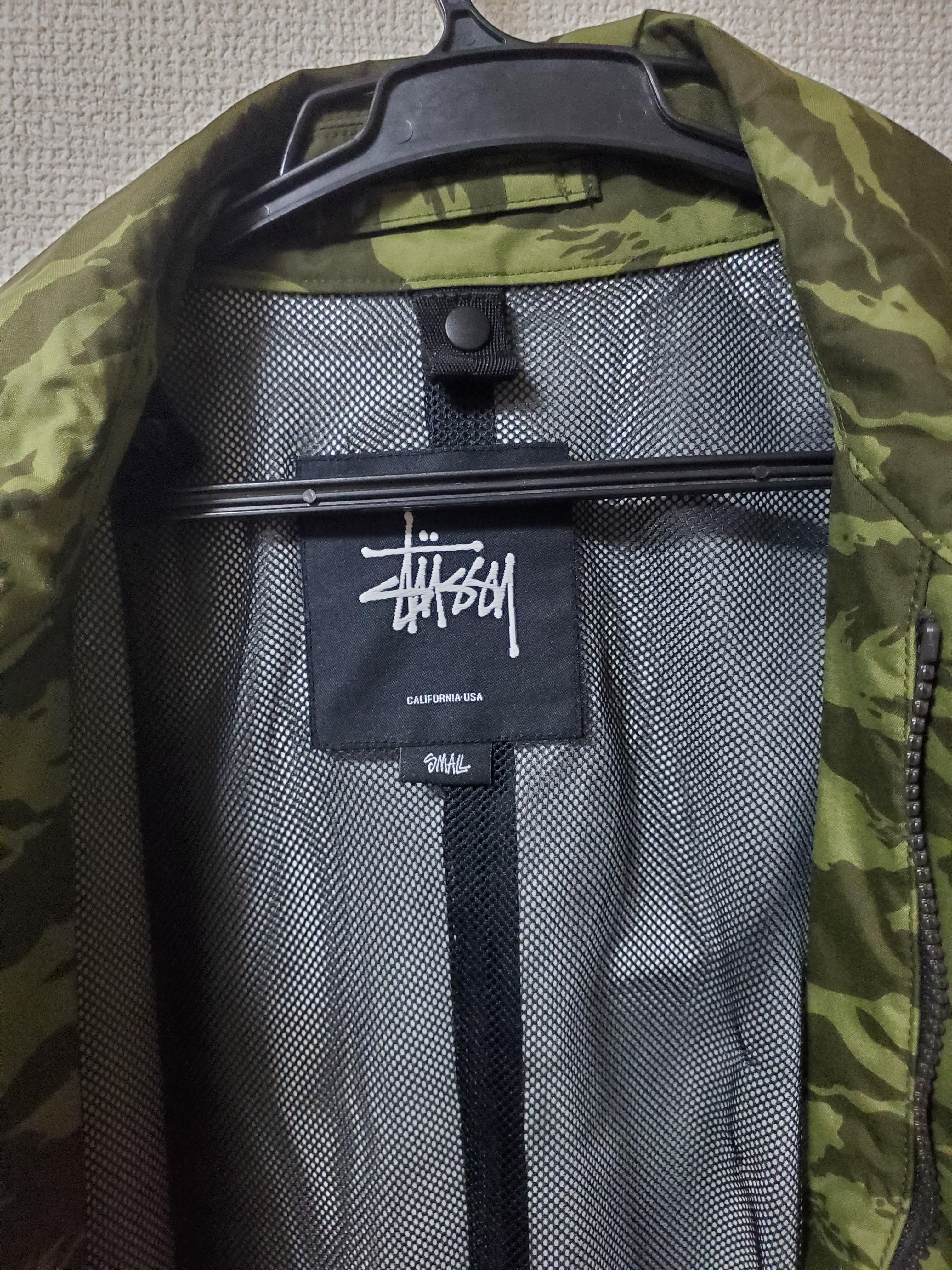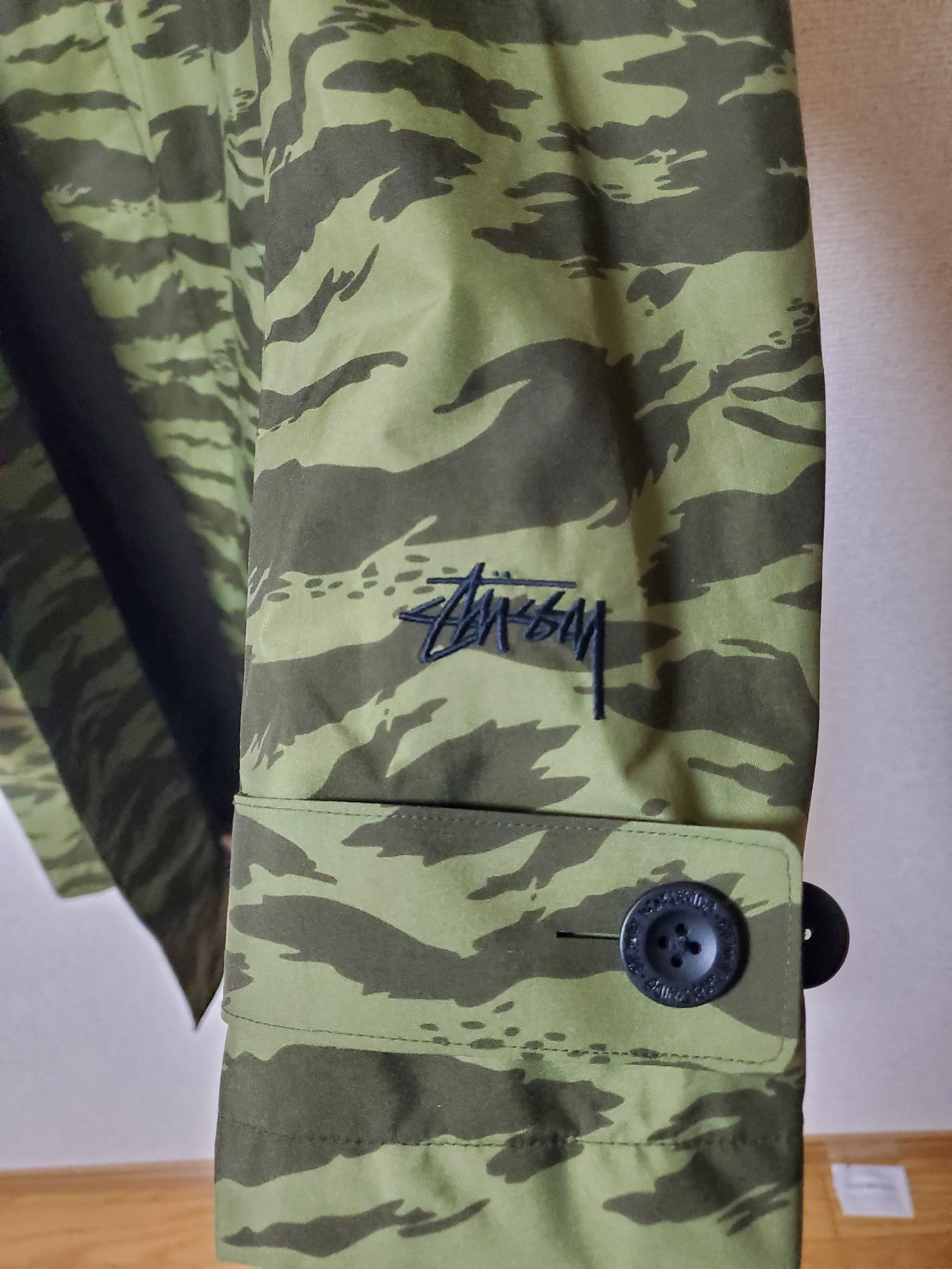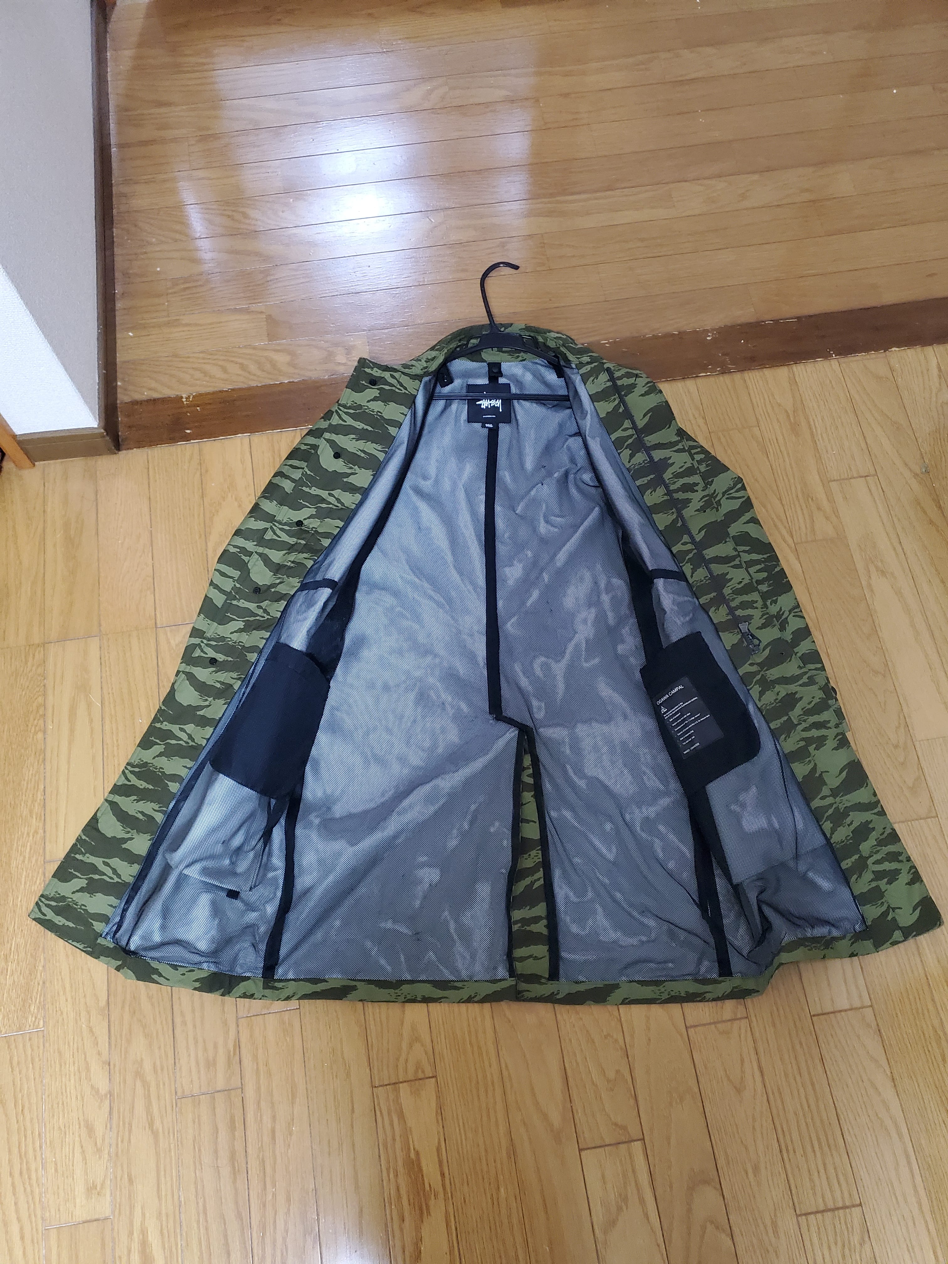 春購入後着用機会が少ないので出品いたします。大人なステンカラーコートのシルエットと個性的な迷彩柄がマッチしていてとてもおしゃれでかっこ良いです!173cm63kgの自分でピッタリサイズです。素人保管ですのでご理解ある方のみ購入ください。返品交換不可です!#stussy