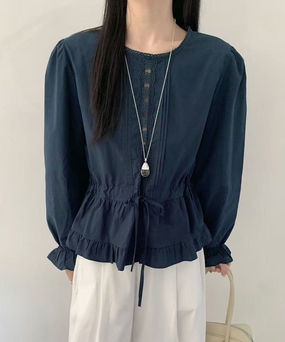 繊細なピンタックとレース刺繍が施された上品なブラウス。