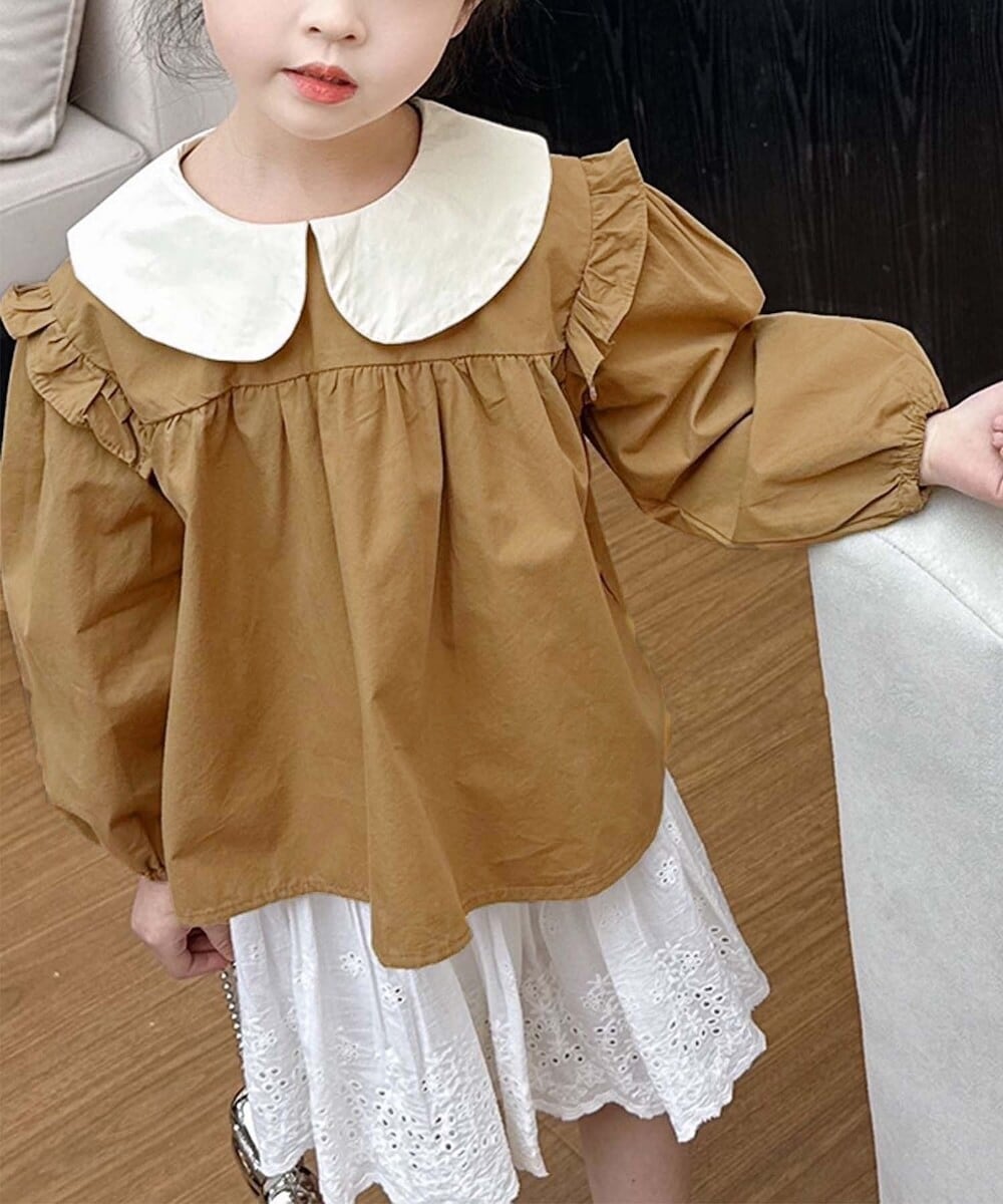 バイカラーの大きな襟が特徴的なキッズブラウス。