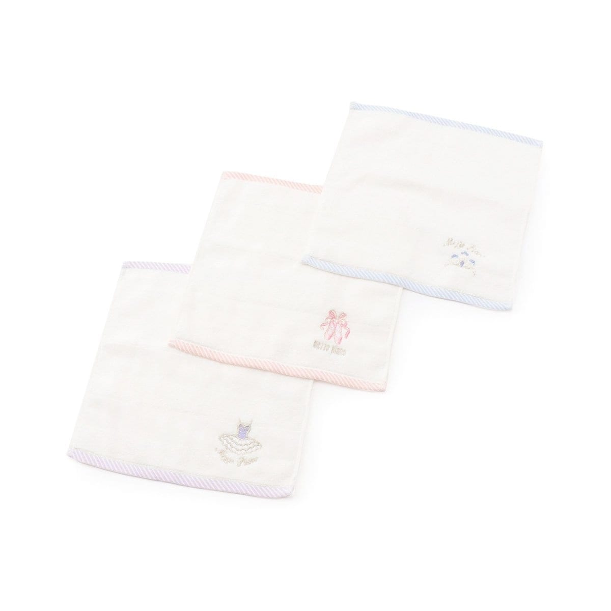 バレエモチーフが刺繍されたバンドタオル3枚セットです。トゥシューズ、チュチュ、ティアラと3枚それぞれモチーフ違いの刺繍を入れました。ヘムのストライプカラーもそれぞれモチーフに合わせたカラーリング。オリジナルギフトBOX付きなのでバレエの発表会でのギフトはもちろん、クリスマスプレゼントにオススメアイテムです。