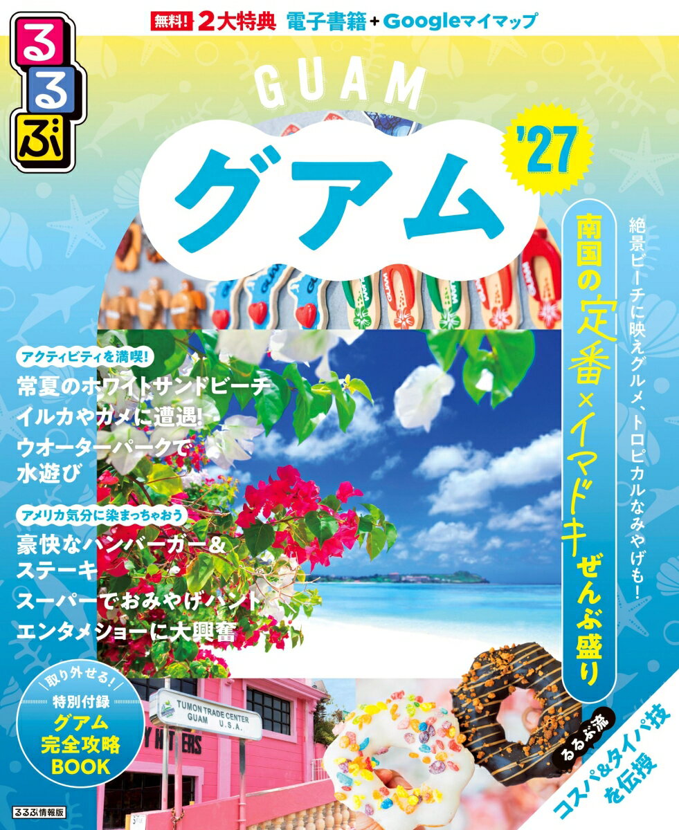 ◎スマホやタブレットで使える便利な電子書籍+Googleマイマップ付き◎大きくて見やすいサイズ(通常版/25.7×21cm)と、持ち運びに便利な「ちいサイズ」(22.3×18.2cm)の2つのサイズ展開! こちらは通常版の商品ページです。◎表紙がオシャレにリニューアル!日本から3時間30分〜4時間のフライトで行ける、常夏の島「グアム」。リゾート地として人気のグアムの定番スポットから話題の最新スポットまで、欲しい情報がぎゅっとつまったガイドブックです。<主な特集内容>【巻頭特集】グアムの定番×イマドキぜんぶ盛り!美しいビーチカフェ&スイーツカラフルスポット南国みやげ&ローカルライフ体験【グアム早わかり】基本情報&王道モデルプランるるぶ流タイパ&コスパ術を伝授【遊ぶ】タモン早わかり&ビーチ大満喫ガイドマリンアクティビティ大自然アドベンチャー2大ウォーターパーク攻略ほか【食べる】グアムBESTスイーツ7選リゾートスタイルで楽しむグルメ(オーシャンビュー、朝ごはん、ハッピーアワーなど)アメリカンスタイルグルメで楽しむグルメ(ハンバーガー、ステーキ、ピザ)ほか【買う】主要ショッピングセンター徹底ガイドスーパーマーケット活用術メイドイングアムのショップ南国雑貨&リゾートファッションコンビニ活用術【泊まる】シーサイド&シティホテルホテルスパで極上の時間【子どもとグアム】成功旅テクニック【旅の情報】旅の準備&入国と出国現地情報、トラブル対処法、交通ガイド【掲載エリア】 タモン ハガニア タムニング ●「るるぶ」は、「みる」「食べる」「遊ぶ」を中心におすすめエリアやスポットを徹底紹介した旅行ガイドブックです。国内・海外あわせて約200のラインナップを展開、2023年でブランド誕生50周年を迎えました!「るるぶ」の特徴はこちら・写真が多くてわかりやすい!・最新情報がたっぷり!・見やすい地図もついてくる!初めて訪れる方からリピーターまで、幅広い方々により旅行を楽しんでいただけるガイドブックです。