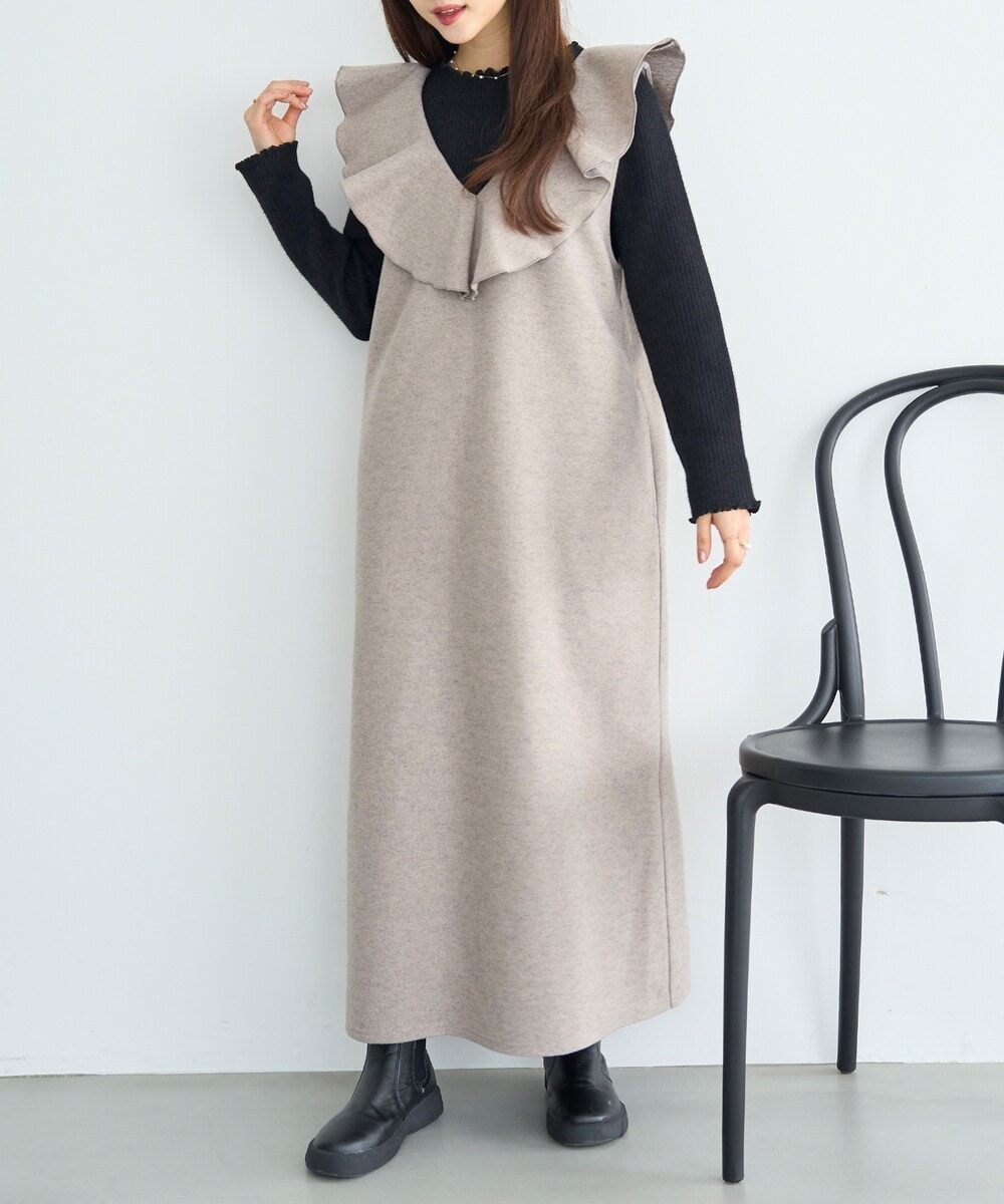 ウールライクな素材を使用した、暖かみのある柔らかな風合いが魅力のワンピース。