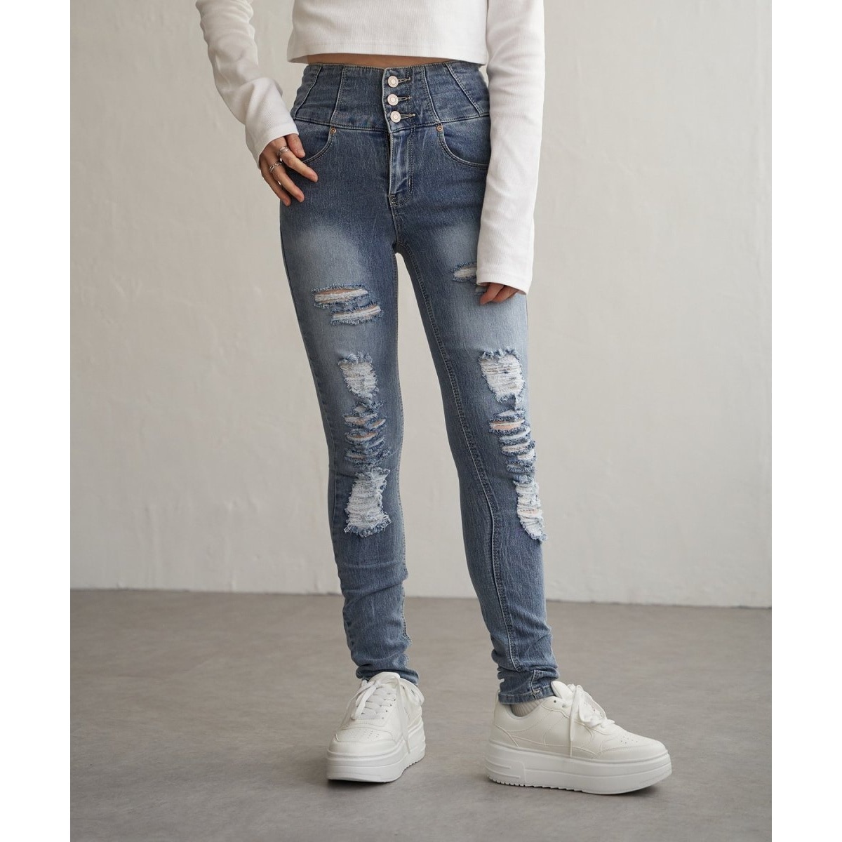 脚長効果抜群のシルエットと、辛口ムード漂うダメージ加工が魅力のハイウエストデニム。