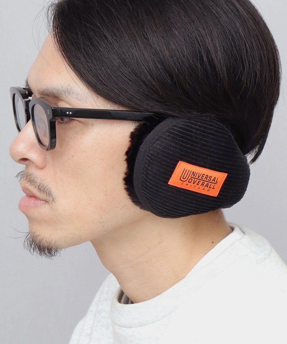 秋冬定番のコーデュロイ生地を使用したコーデュロイイヤーマフラー。UNIVERSALOVERALのオレンジのブランドネームがワンポイントに。
