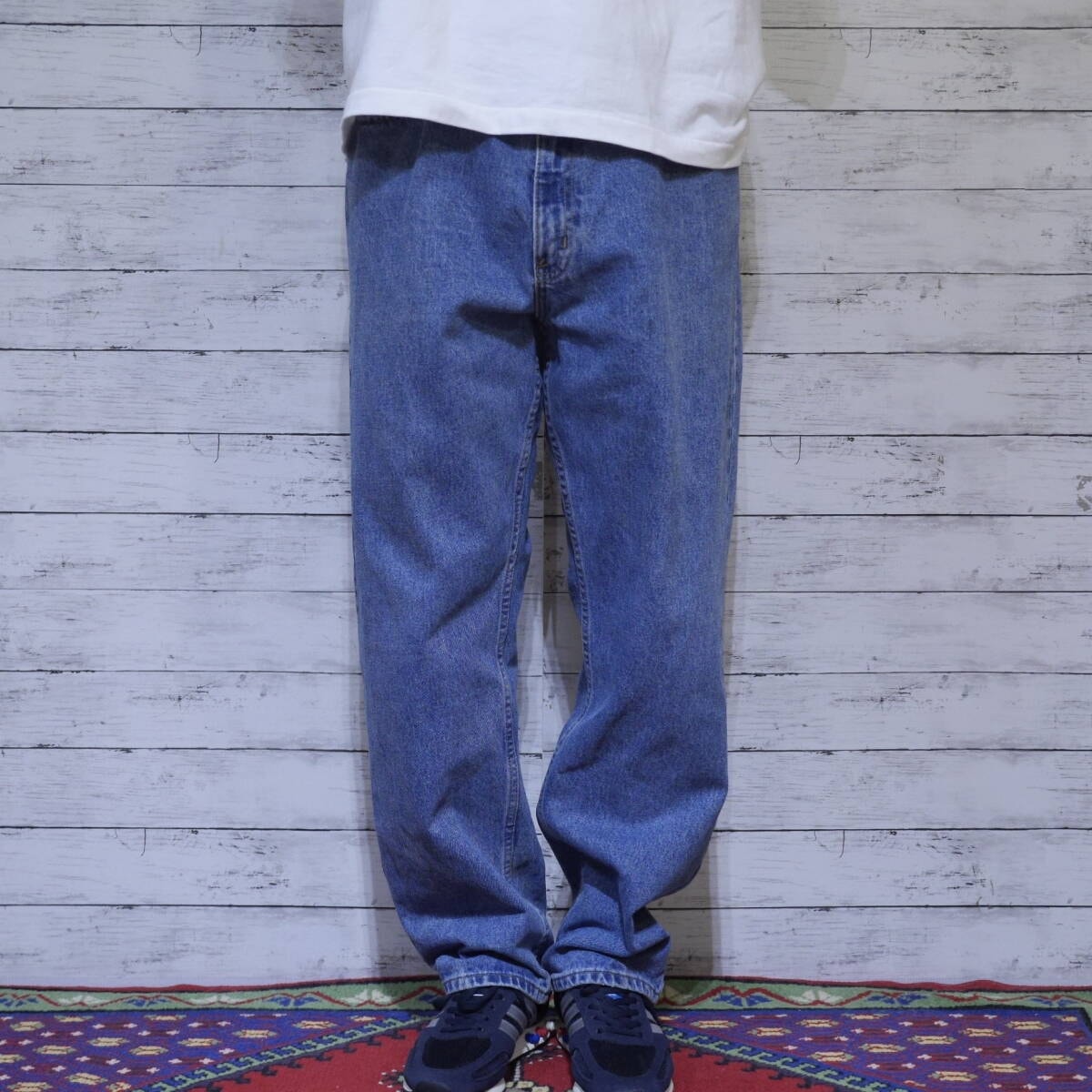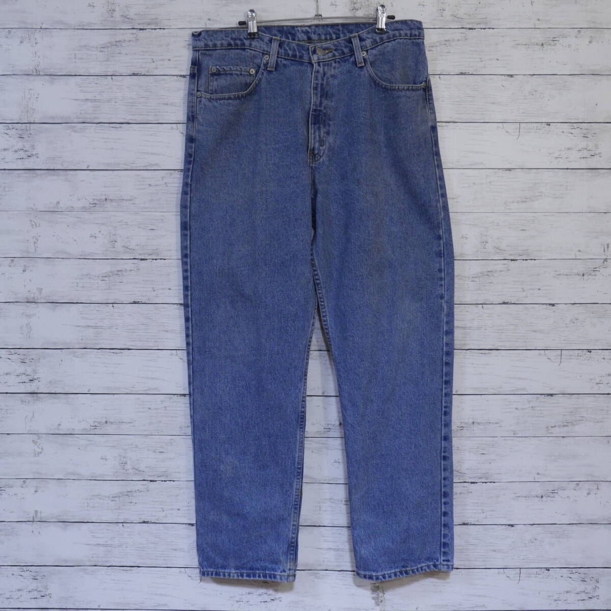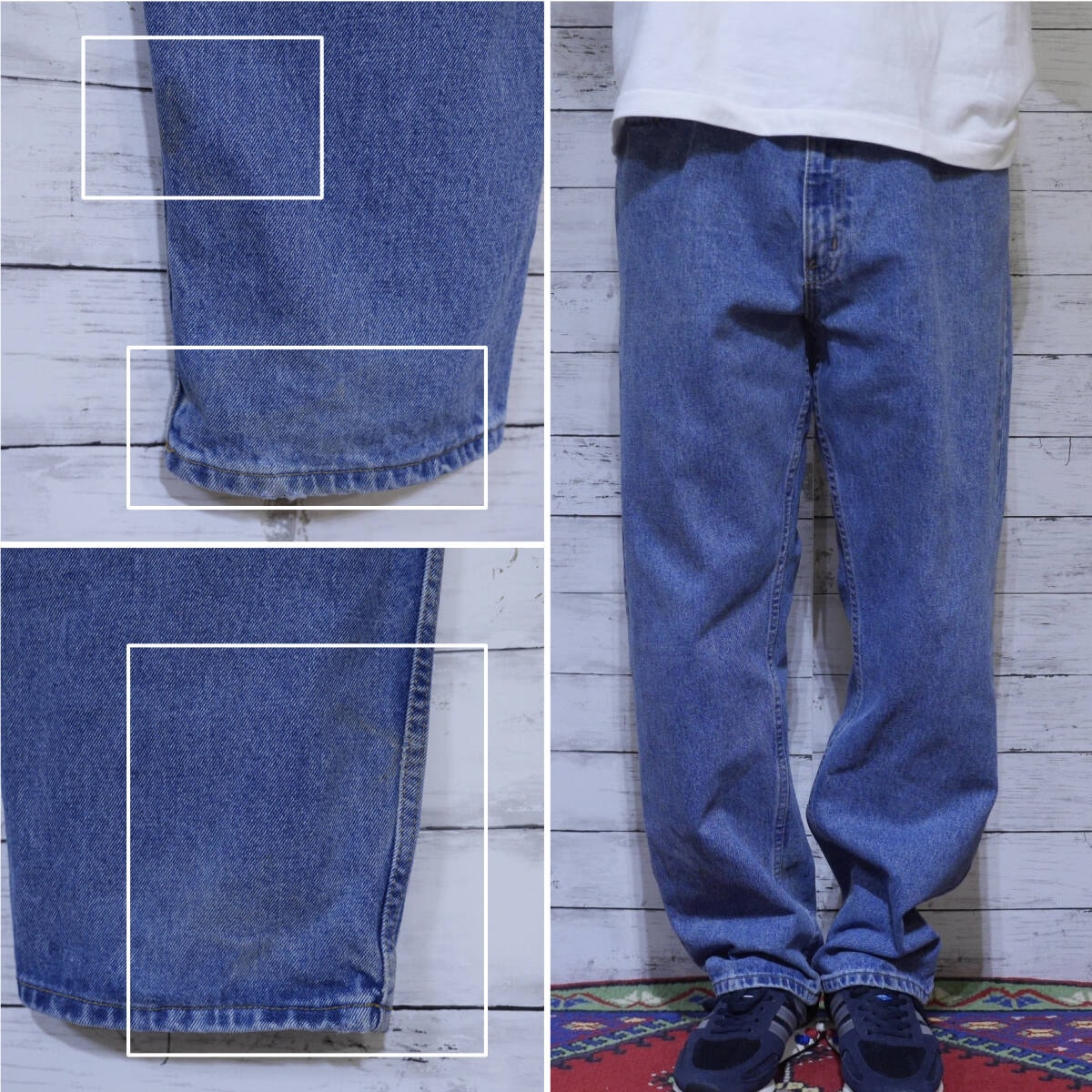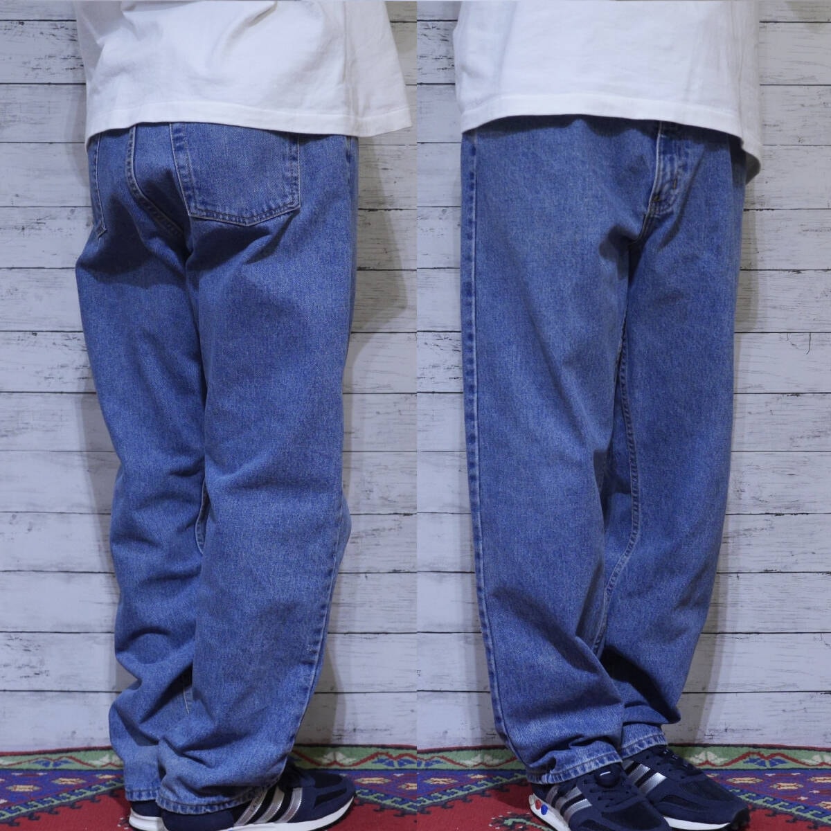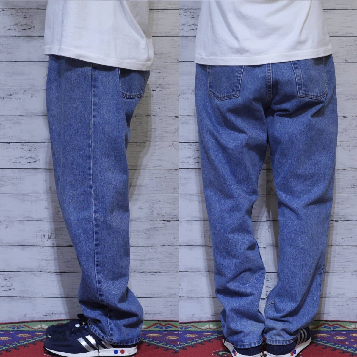 ■商品のポイント・POLO JEANS ポロジーンズ ファイブポケット ワイドテーパード デニムパンツ RELAXED リラックスド・生地は厚手のヘビーオンスのデニム、全体的にフェードした合わせやすいやや薄めのブルー、リーバイスの550、560、シルバータブのようなワイドテーパードシルエット・ワンポイントピス刺繍ロゴ 、YKKフロントジップ、レザーパッチ、裾上げをしていないオリジナルレングス・メンズレディース問わず、ユニセックスに使って頂けるアイテムです