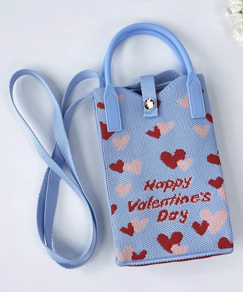 カラフルでポップなデザインが目を引く、ニット素材のミニショルダーバッグ。