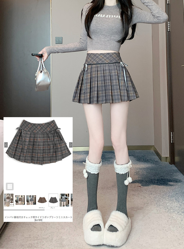 インパン裏地付きチェック柄サイドリボンプリーツミニスカート[ks189]