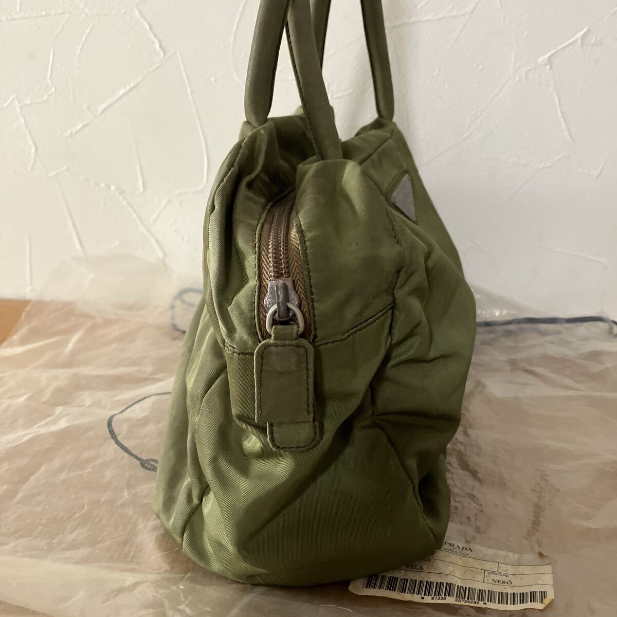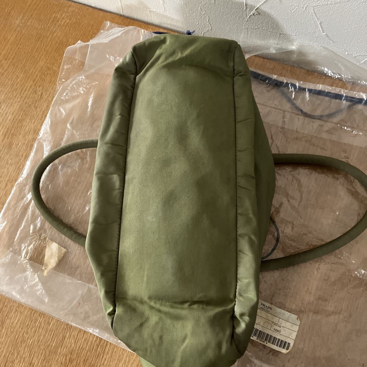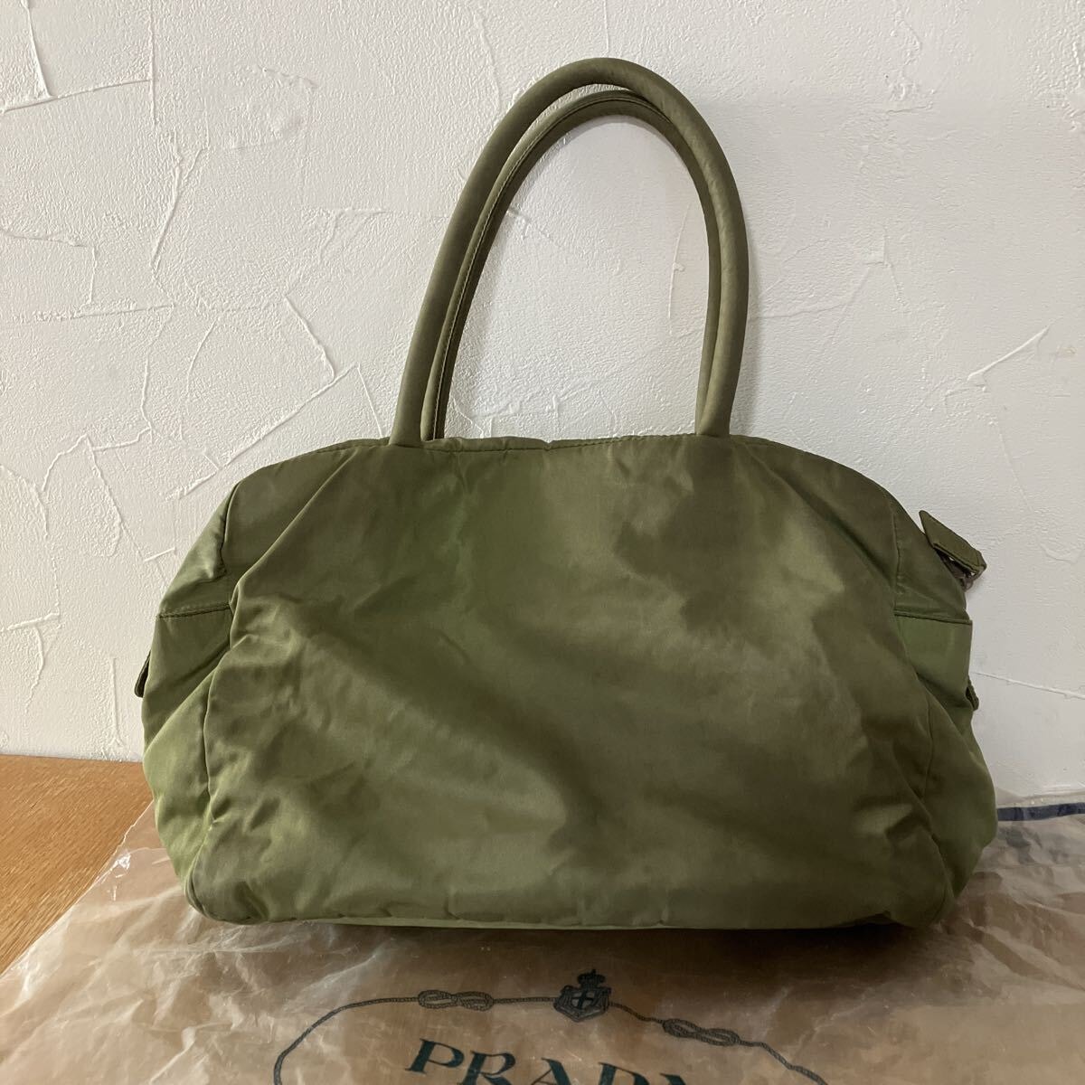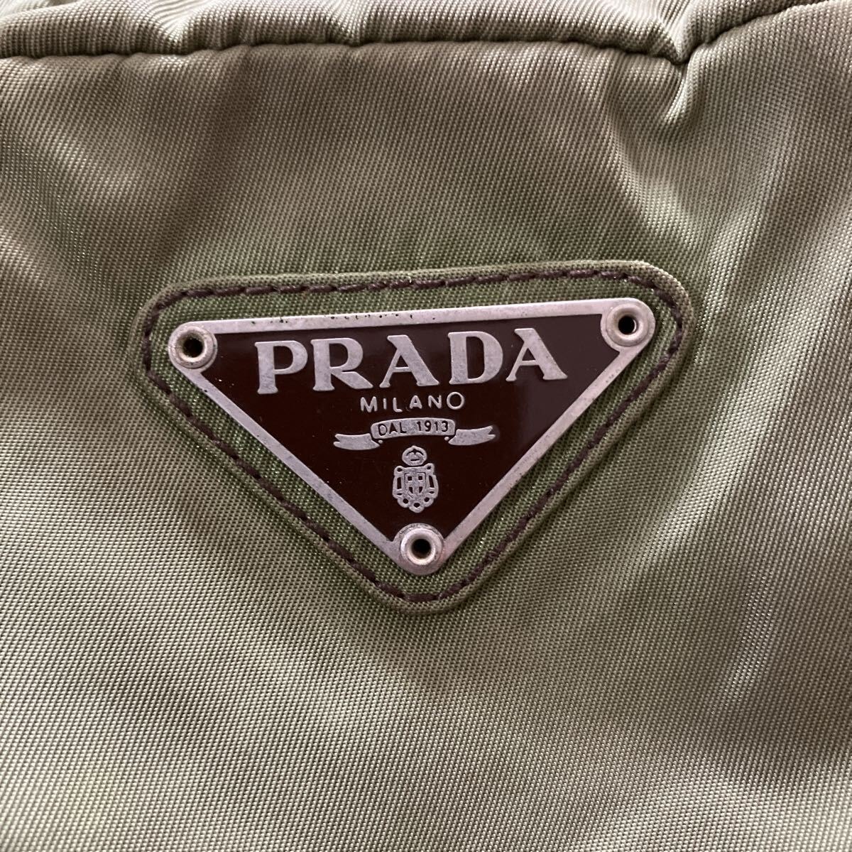 PRADAのナイロン製トートバッグです。カーキ色の本体に、PRADAの象徴である三角ロゴプレートが特徴的です。普段使いにぴったりのサイズ感で、様々なシーンで活躍します。