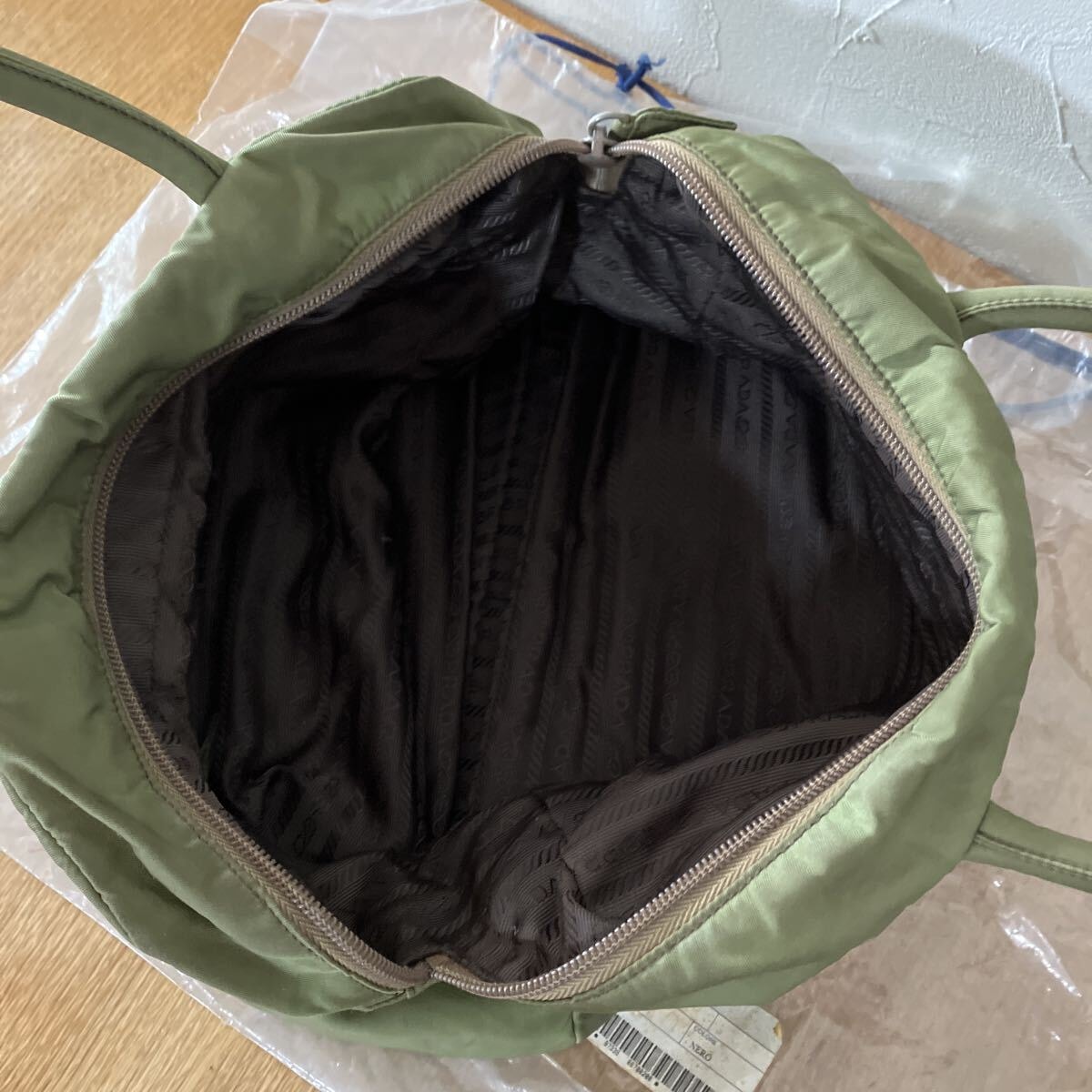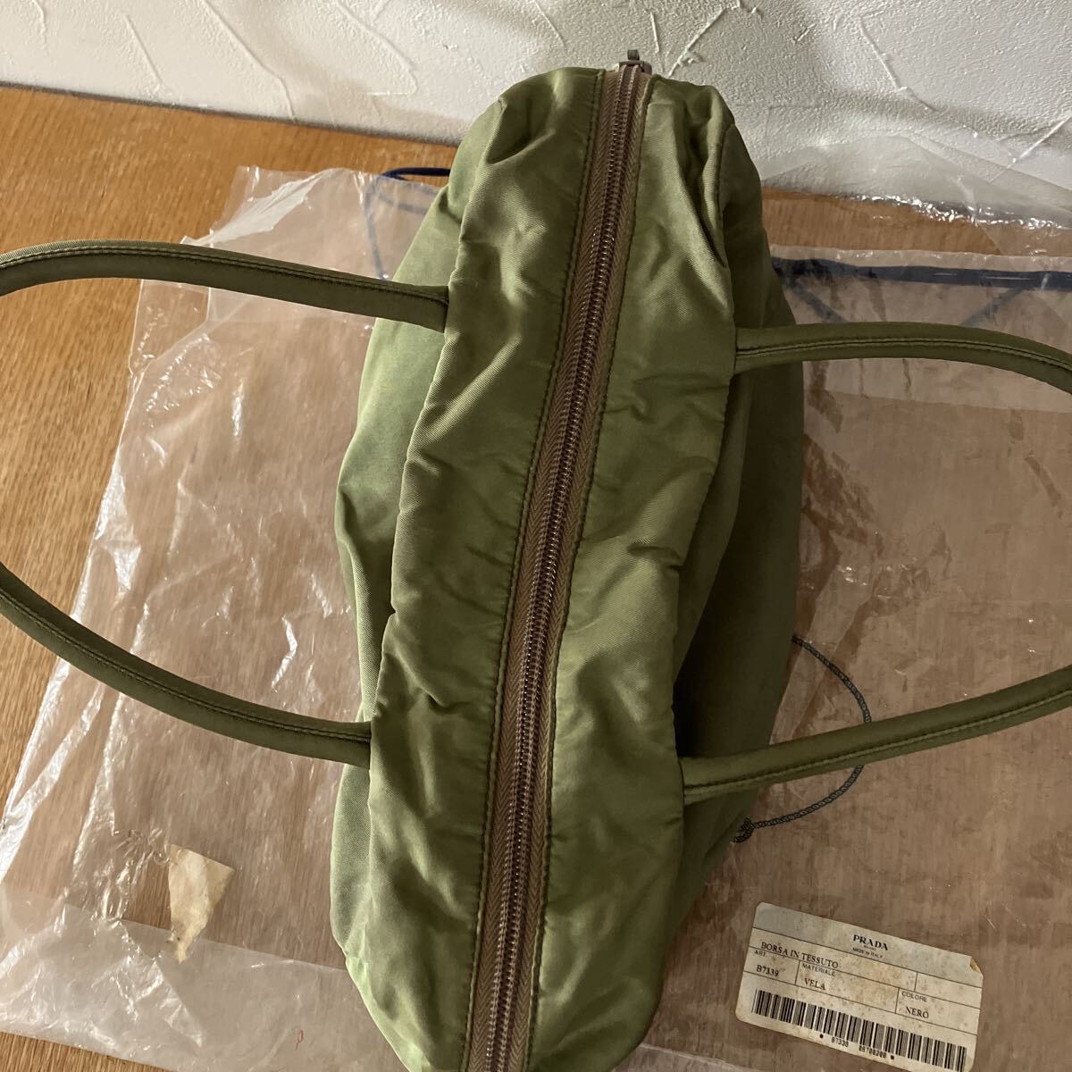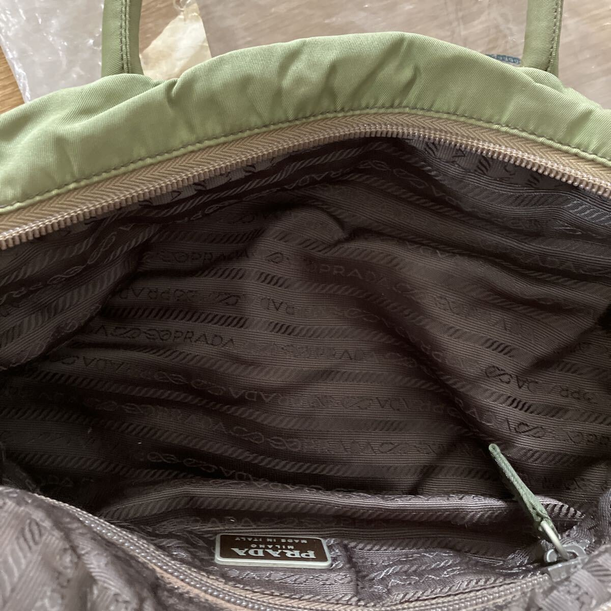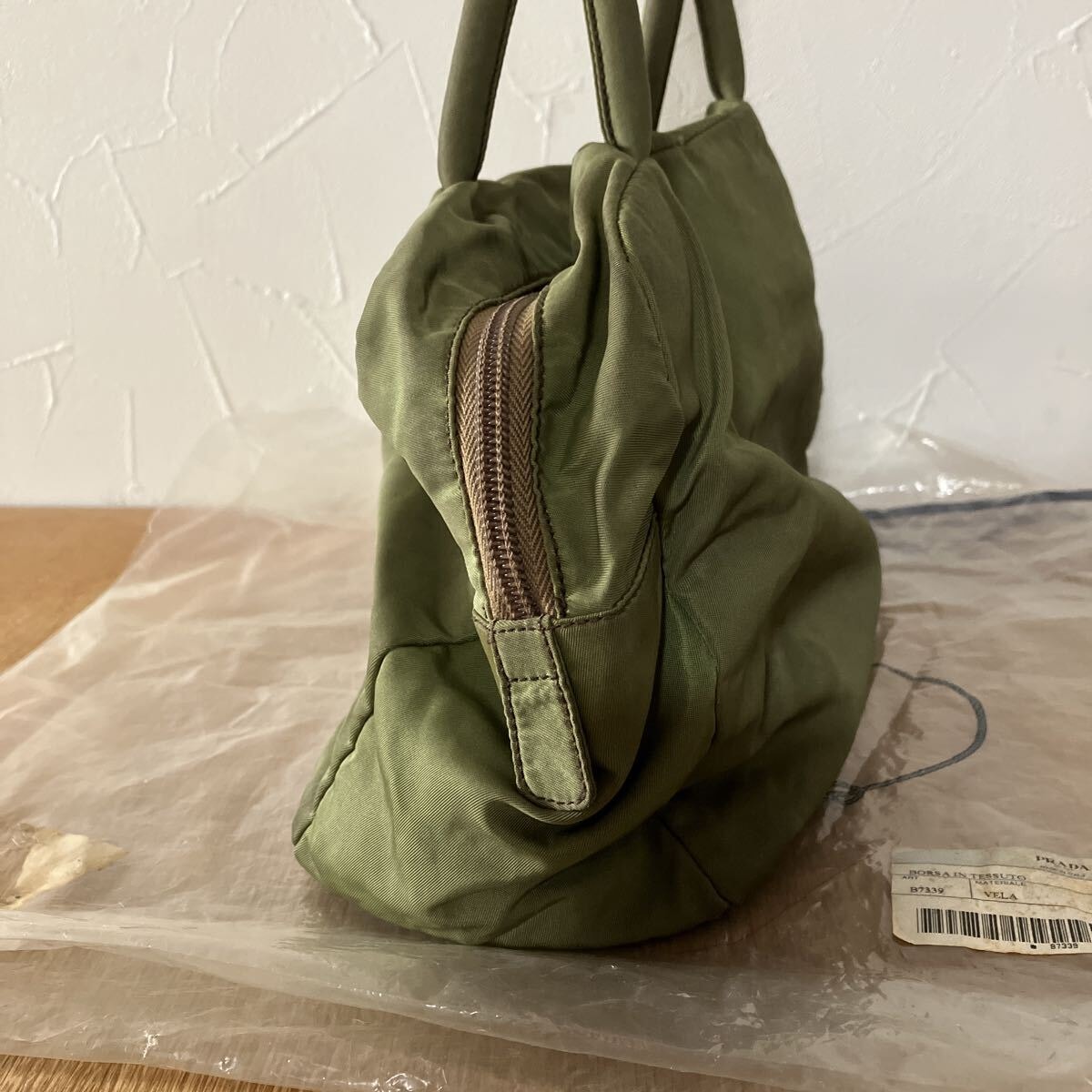 PRADAのナイロン製トートバッグです。カーキ色の本体に、PRADAの象徴である三角ロゴプレートが特徴的です。普段使いにぴったりのサイズ感で、様々なシーンで活躍します。