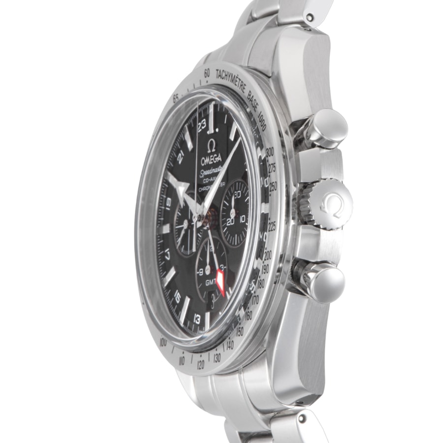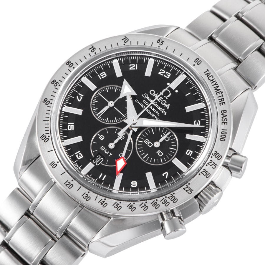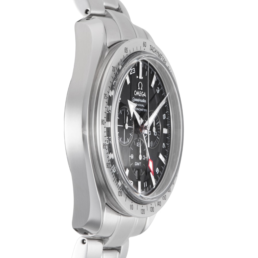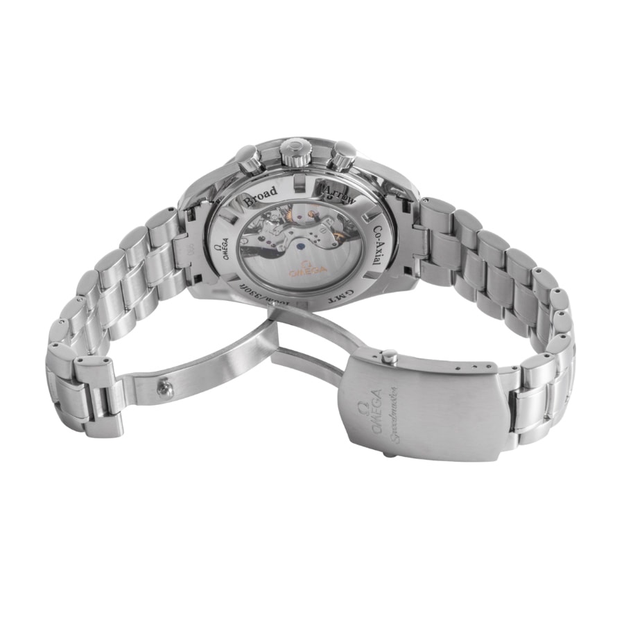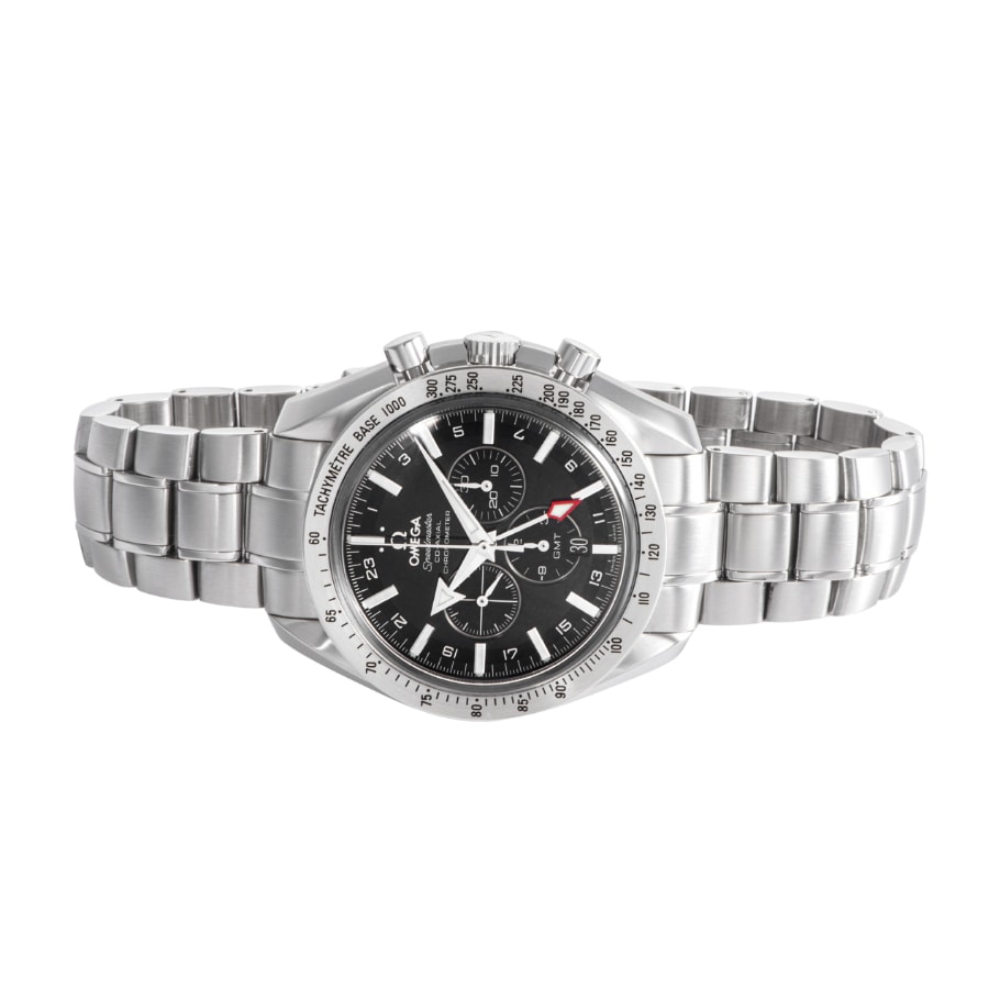 精悍なブラックダイヤルに立体的なブロードアロー針を備え、クラシックな雰囲気と力強さを兼ね備えた一本です。ステンレススチールケースとブレスレットが重厚感を演出し、ヴィンテージスピードマスターを思わせるデザインが魅力。シンプルながらも存在感のある仕上がりで、幅広いスタイルにマッチします。