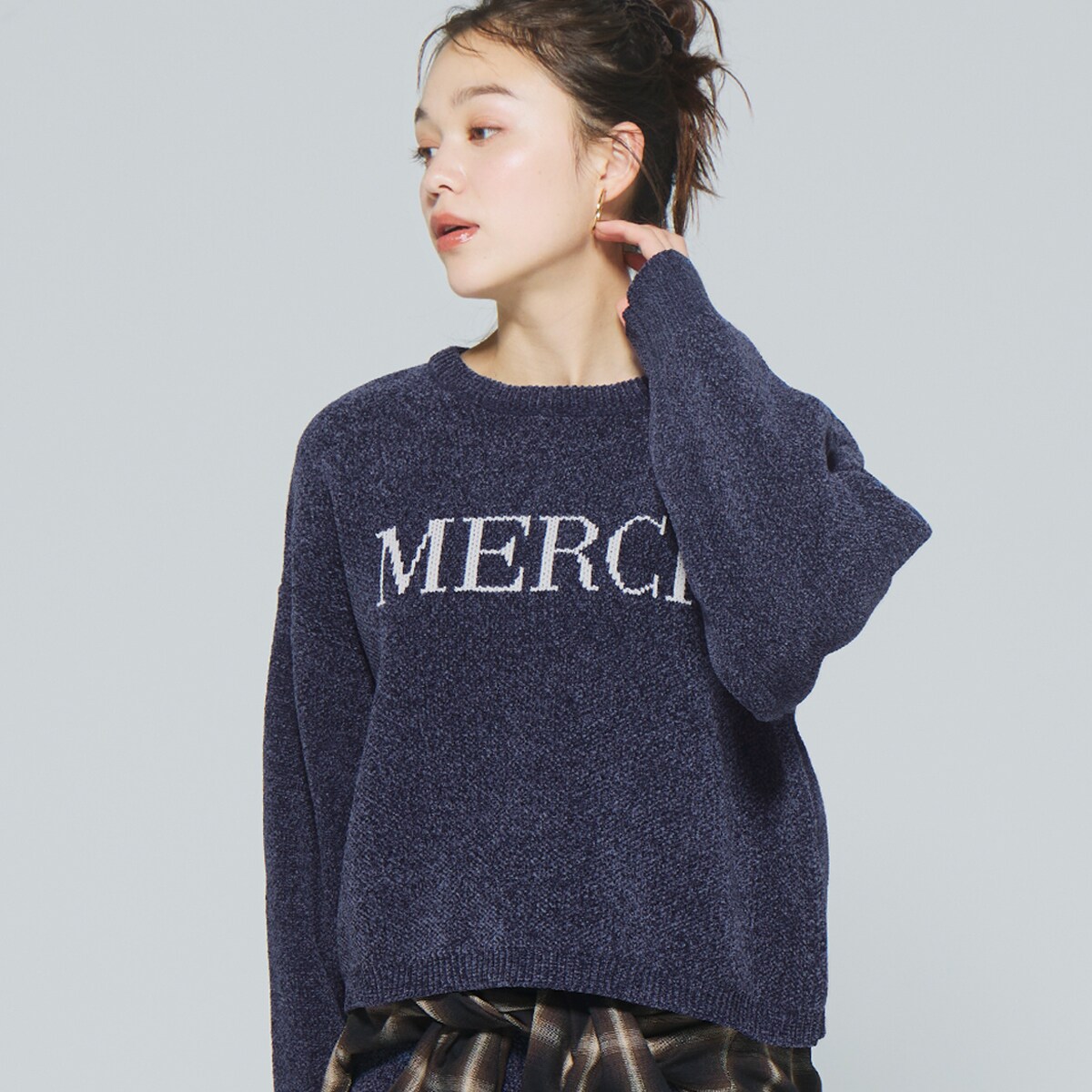 SHIPS any モールヤーン クルーネック ロゴ 千鳥柄 プルオーバー