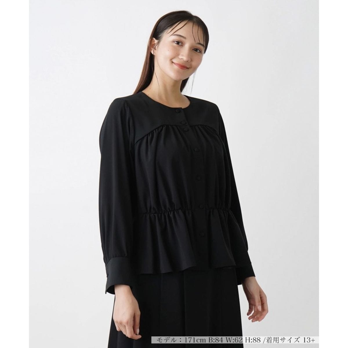 異素材を巧みに組み合わせたお洒落な佇まいのノーカラーブラウス。全体にたっぷりと施されたギャザーが、柔らかく上品なニュアンスを引き立てます。ペプラムシルエットが、大人の女性らしいフェミニンな雰囲気を漂わせる一着に仕上げました。くるみボタンを採用することで、細部にまでこだわりが光るデザインとなっています。シンプルでありながらも、ディテールに宿る上質感が際立つ一枚。
