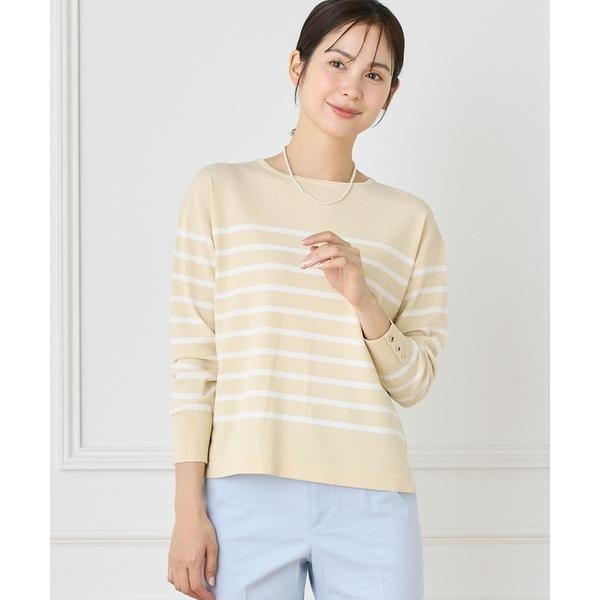カジュアル感を抑えた大人の女性のためのパネルボーダーニット。袖口に光るメタル釦でエレガントな印象に。ほど良く開いたボートネックがすっきりとした首元を演出してくれます。また、インナーとしても着用していただきやすいサイズ感で、ボーダー柄をアクセントとして合わせたスタイルもおすすめです。ボトムスを選ばないストレートな裾ラインで様々なシーンで着回せる便利な一枚です。・水洗い可■サンプル撮影商品■こちらの商品はサンプルでの撮影となっております。実際の商品とは、サイズや色味、素材、デザイン等の仕様が若干変更になる場合がございます。