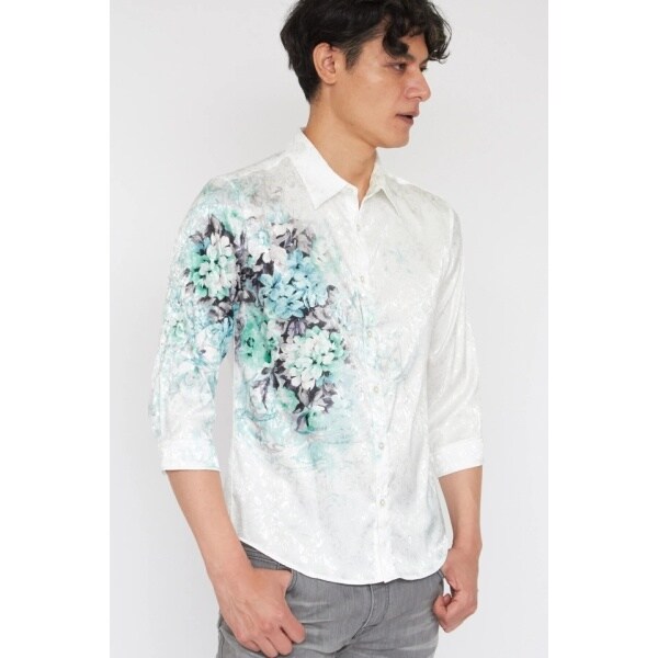フラワーブーケとオーナメントのモチーフをアシメトリーに、グラデーション調に配置しプリントした7分袖シャツ。