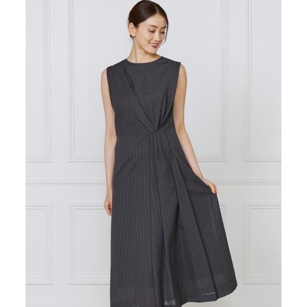 ■デザインウエストタックがアクセントのスリーブレスロングドレス。ボディラインに優しく沿う、女性らしいシルエットと美しいドレープが特徴。程よい肉感で着心地も安心感があり、きちんとした装いにもぴったりです。■素材表面がウールで芯がポリエステルという構造の軽やかで涼しげな印象のシアー素材をストライプ柄にしました。生地方向を変えることで表情豊にしています。毛羽が少なくシャリ感が出るのが特徴です。・後ろファスナーあり・裏地あり■サンプル撮影商品画像の商品はサンプルです。実際の商品とはサイズや色味、素材、デザイン等の仕様が若干変更になる場合がございます。■カラーについては、可能な限り実際の商品に近いカラーで撮影をおこなっておりますが、照明の関係により実際の製品とは色味が違って見える場合があります。またパソコン・スマートフォンなどの環境により、若干製品と画像のカラーが異なる場合もございます。現物と画像のカラー差異については返品理由となりませんので、予めご了承ください。■サイズ表記はあくまで目安となります。