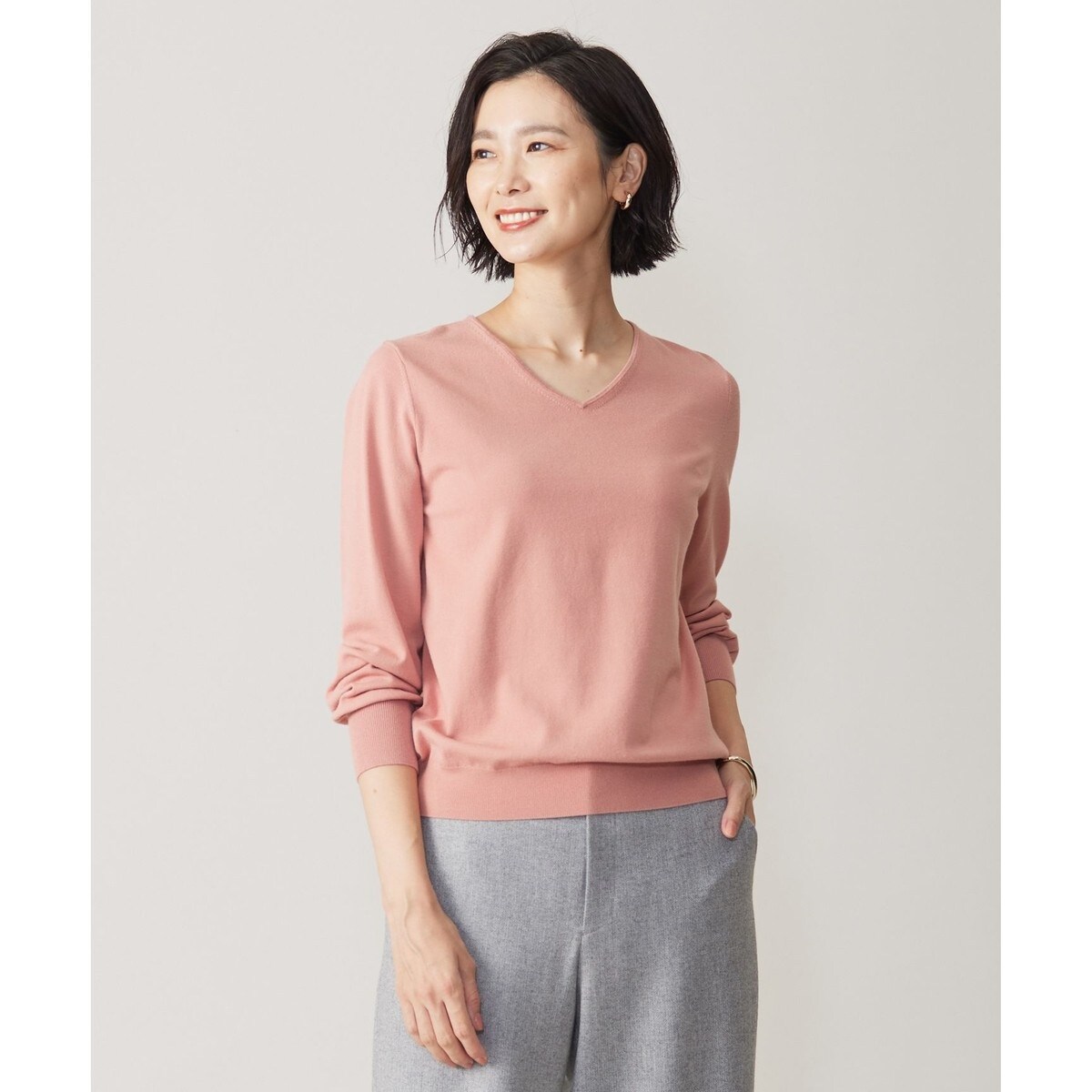 シンプルで凛とした印象の、人気のVネックニット。パイピングで繊細に仕上げた、安心感のある開きすぎない衿開きは、着る人を選ばず品よく着ていただけます。スカートとパンツのどちらとも好相性で、きちんと感があるキレイな表面感のためジャケットのインナーとしても大活躍。合わせるアイテムによって、秋口から季節を跨いで長い期間着用できます。