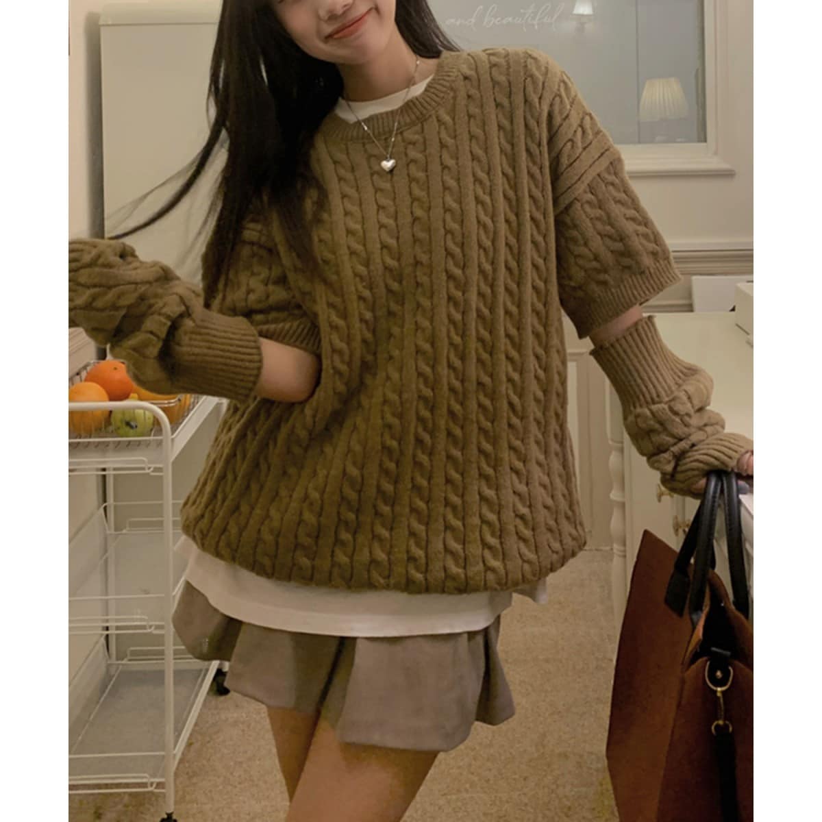 アームウォーマー付きショートケーブルニット