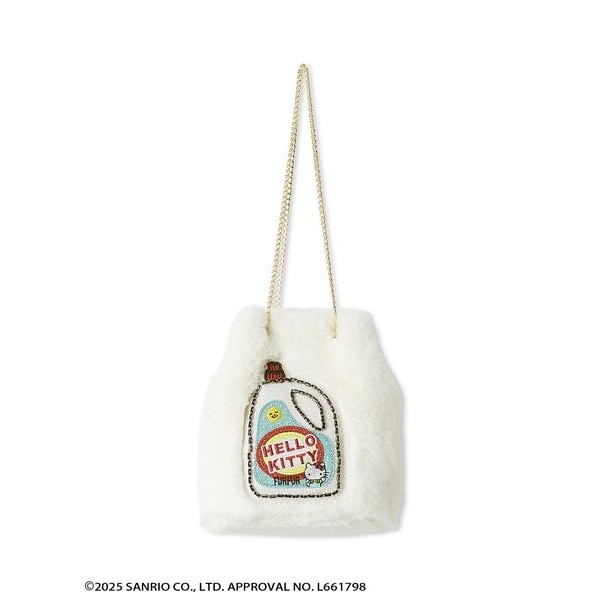 ハローキティとのコラボレーション。洗剤アートのモチーフをワッペンで表現した巾着型のエコファーバッグです。グリッター素材の生地を幾重にパッチワークし、糸刺繍やビジュー手刺繍で加工を加えた高級感のあふれるワッペンに仕上げています。チェーンの長さを変えられるので、ハンドバッグ、ショルダーバッグとして2wayでお使いいただけます。