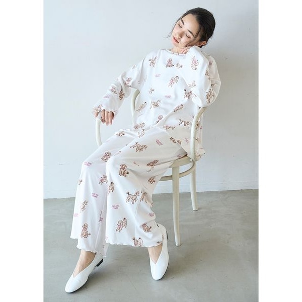 首元に大きなリボンを付けたプードル柄がポイントのロングパンツ。ウエストにフリルをあしらったロングパンツは、裾にメローを入れてフェミニンな表情を演出。ワイドなゆったりシルエットで、カジュアルながらも女性らしさをお楽しみいただけるアイテムです。色はオフホワイトとグレーの2色展開。同シリーズのロングパンツとセットアップで着用いただけます。