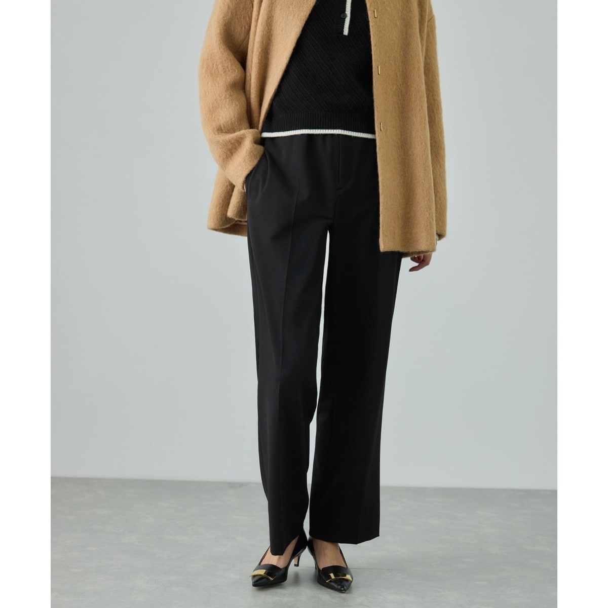 ウエストゴムの仕様ながら、すっきりとしたシルエットで着用できるストレート見えのセミフレアパンツ。ややストレッチ性のあるカットソーのようにイージー着用可能な美脚シルエットです。正面のみゴム仕様のため、後ろのヒップがきれいに見えます。また、ウエストにはドロストコードもついており、結びの強弱でウエストのフィット感が調整可能です。
