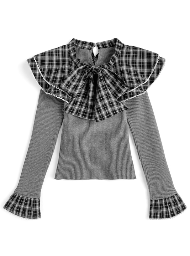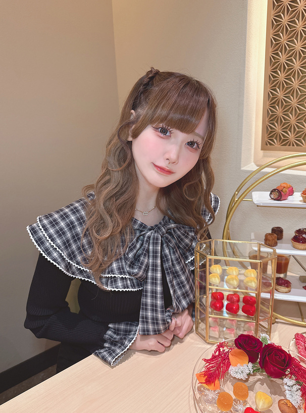 チェック柄生地を使用したリボンやフリルカラーが、顔まわりを華やかに演出。