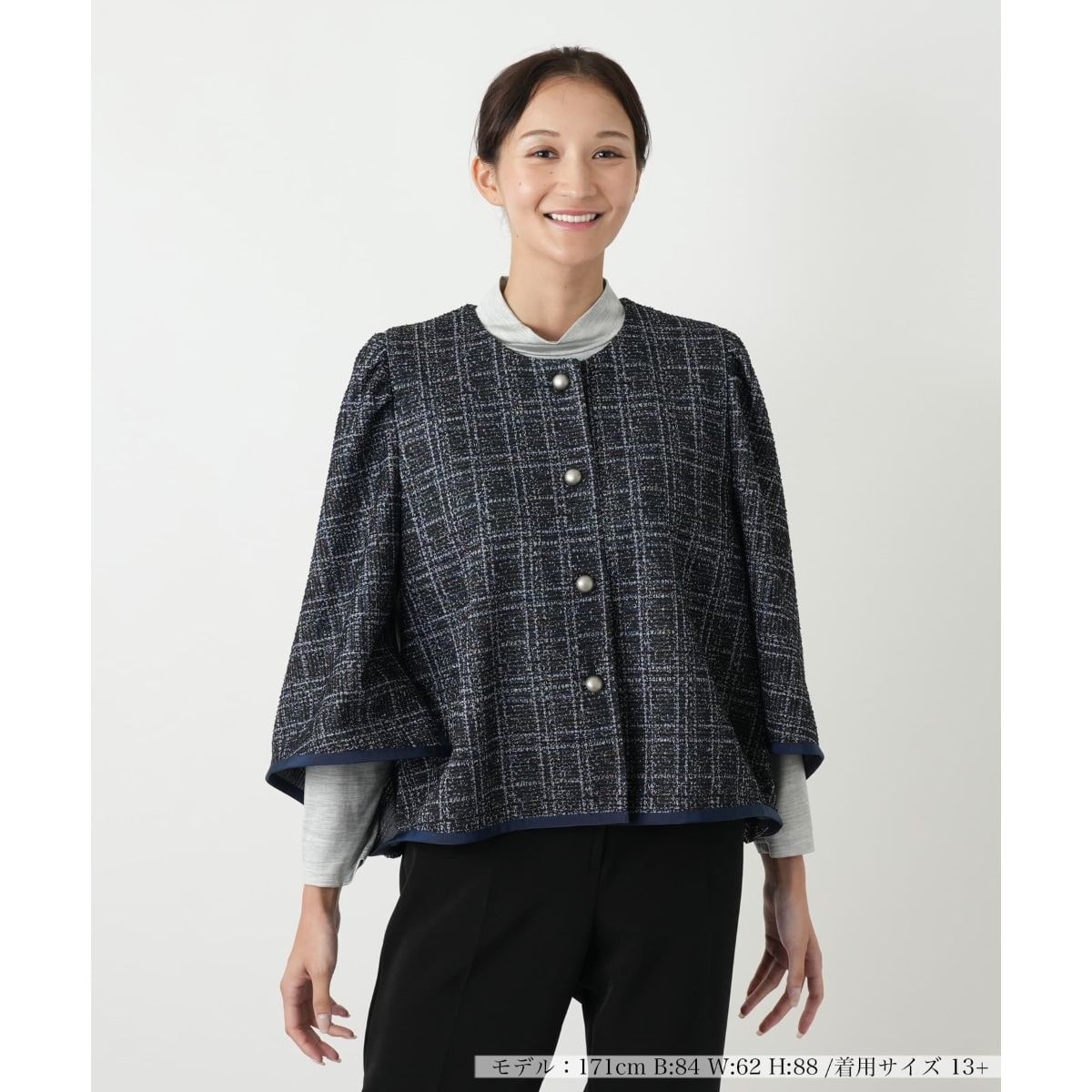 表情豊かなミックスツイード素材が魅力のポンチョ風ジャケットです。ノーカラーの首元と丸みのあるシルエットが、女性らしい柔らかな印象を与えます。フロントのアンティーク調のボタンがアクセントとなり、上品な雰囲気をプラス。袖口からインナーを覗かせるデザインは、レイヤードスタイルをより豊かにします。羽織るだけで華やかさとこなれ感を演出でき、デイリーユースはもちろん、ちょっとしたお出かけにも活躍する、着回し力の高い一枚です。