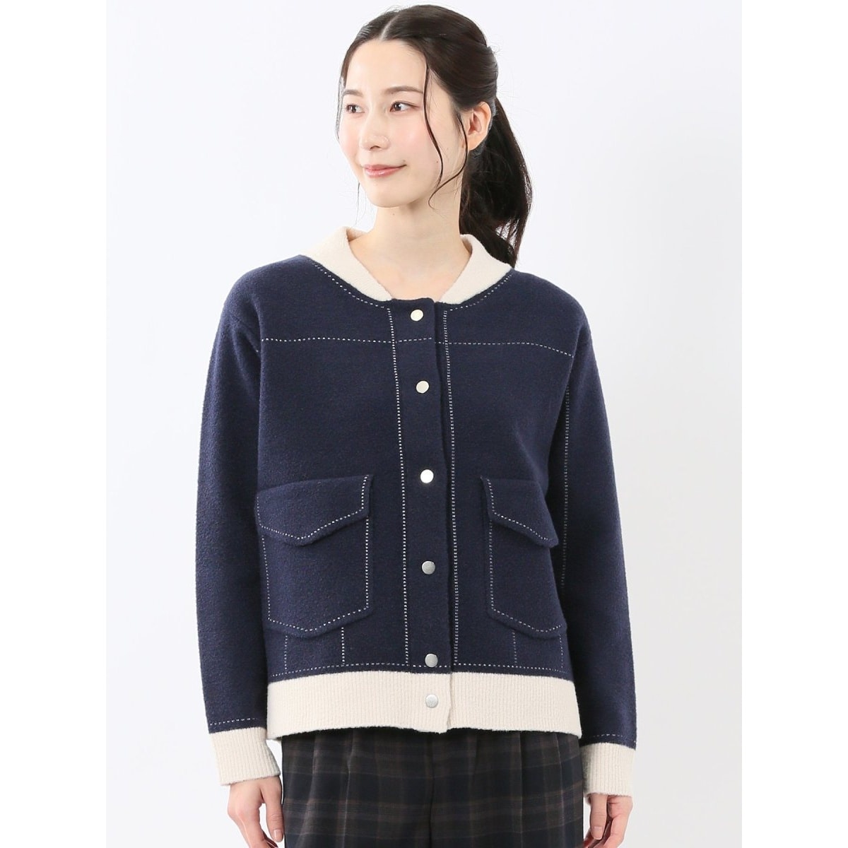 カーディガンのような感覚で軽く羽織れるニットブルゾンです。ステッチ風の編地、ドットボタン、袖口と裾部分のリブ切り替え、フラップ付きポケットがポイント。気温調整が難しい季節の変わり目に大活躍してくれます。