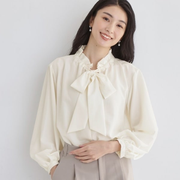 スタンドフリルとボウタイリボンがあしらわれたクラシカルで上品なブラウスは、ほどよいボリューム感のパフスリーブが特徴です。