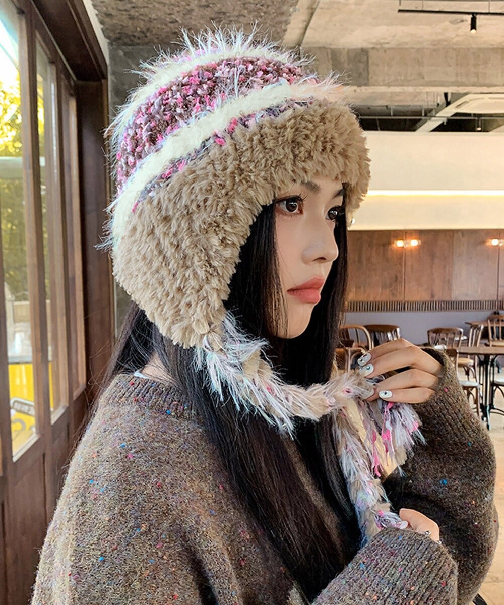 ふわふわのボア素材とニット生地を組み合わせたデザインで、見た目もかわいらしく、防寒性にも優れています。