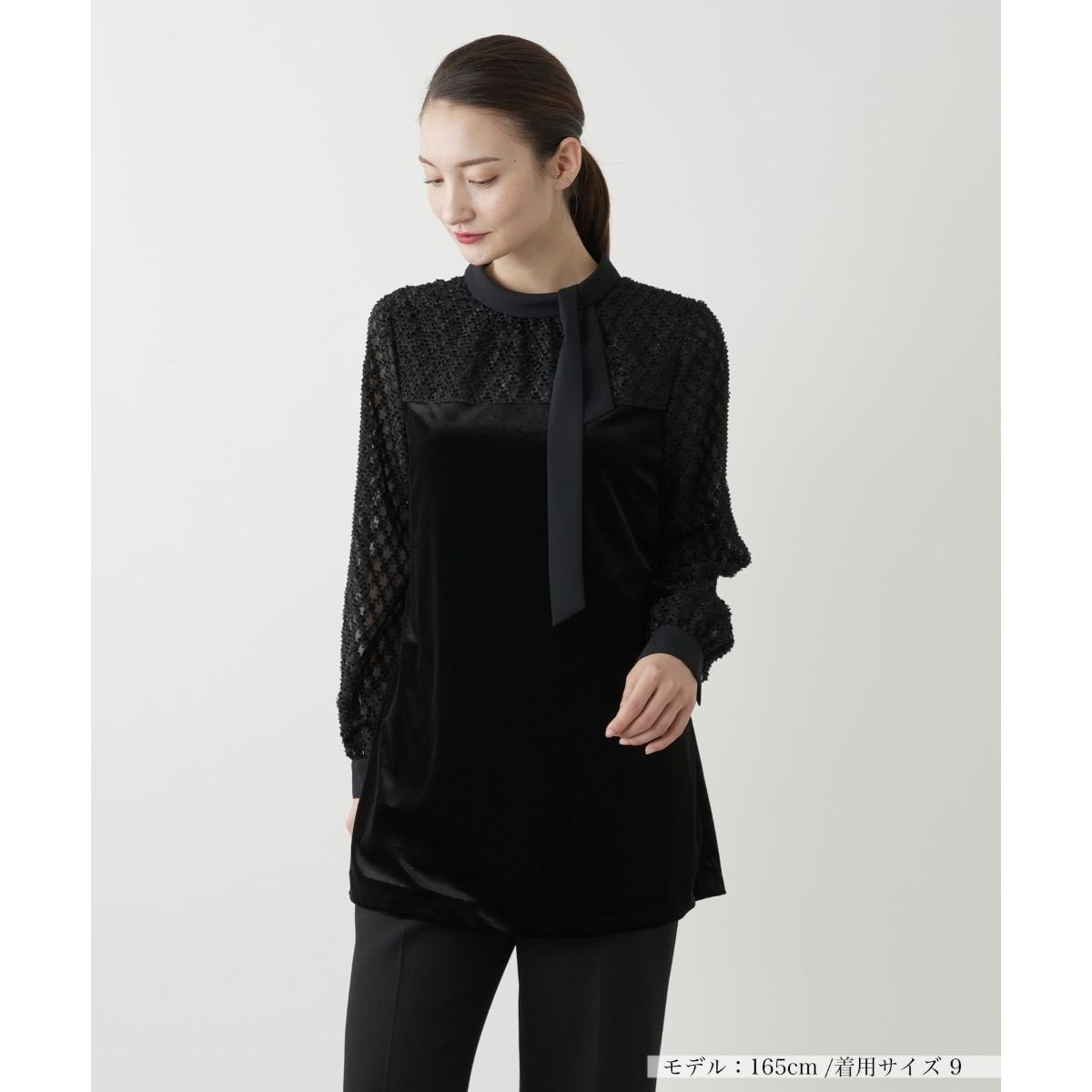 ユニークな素材でダイヤモンド模様が美しく表現された生地と、シンプルな無地を巧みに切り替えたボウタイブラウス。柔らかくふんわりとしたスリーブラインが、女性らしい優雅なムードを引き立てます。シックで統一感のある色使いで様々なボトムスと合わせやすく、スタイリングの幅が広がります。ヒップまでを自然にカバーする絶妙な丈感なので、スタイルアップ効果も期待できそうです。