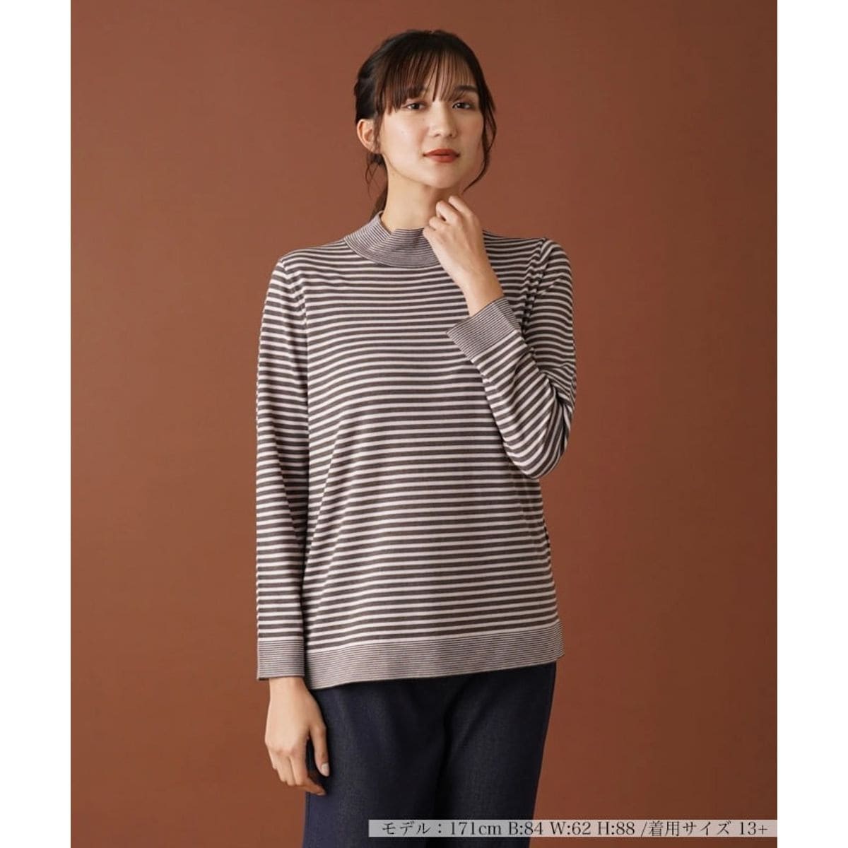 リズミカルなボーダーが彩る、スタイリッシュな雰囲気のハイネックカットソー。ネックや袖口、裾はピッチの異なるボーダーで切り替え、表情に変化を生み出しています。やや薄手の生地は肌当たりがよく、すっきりとしたオーソドックスなシルエットだからもたつき感なく仕上がります。一枚ではもちろん、ジャケットやワンピースのインナーにしてもバランスよく着こなせます。