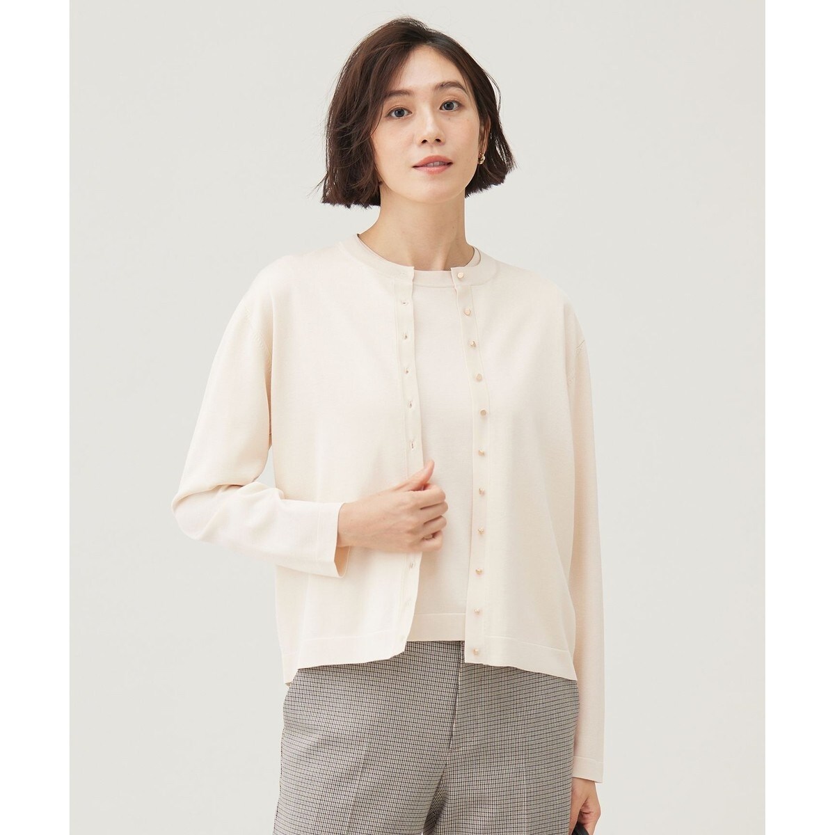 アンサンブル対応の上品なキレイめカーディガン■デザイン素材の持つ上品な光沢感を活かしたシンプルなカーディガンです。クラシックな雰囲気になりすぎないように、少しだけ肩をドロップさせリラックスしたシルエットに仕上げています。アクセサリー感覚の華奢で小さなメタル釦は間隔を狭めて配置し、自由区のオリジナリティを感じさせるディテールです。同素材のプルオーバーニット(KRWRCA0358)とアンサンブルでの着用がおすすめです。■素材程よいハリコシと上品な光沢が特徴で、ソフトでシャリみのある発色が美しい素材です。表面はアセテートの繊細な光沢が女性らしく滑らかなタッチで、肌につく裏面は肌触りの良いコットン素材なので、暑い時期から通期にわたり着用できるアイテムです。■同素材アイテムプルオーバーニット(KRWRCA0358)
