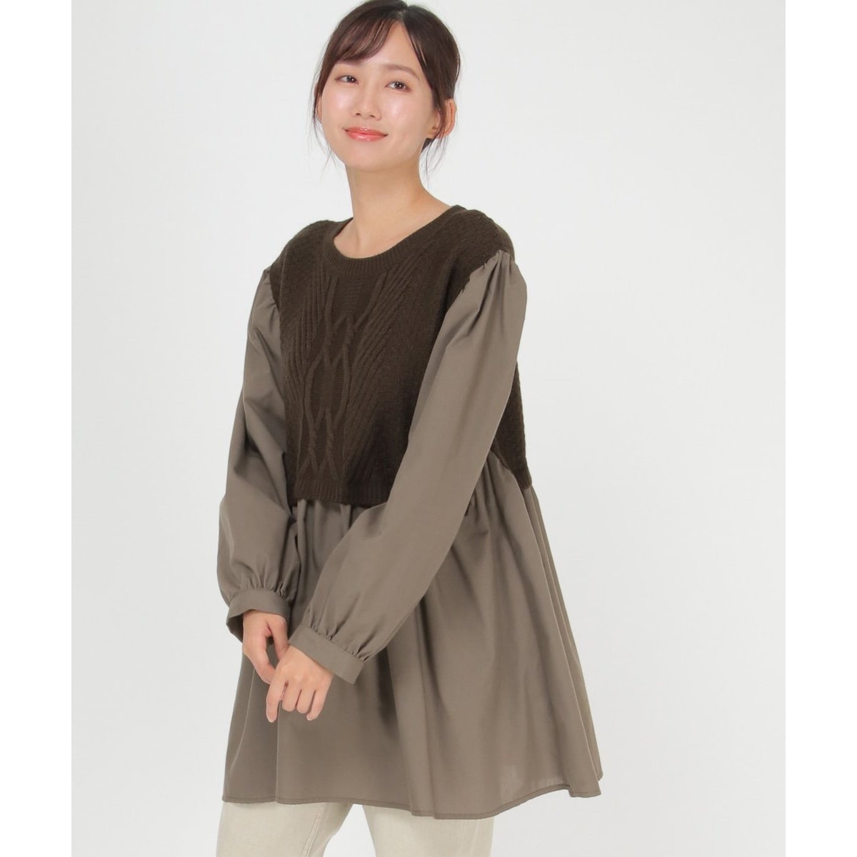 チュニック丈の布帛生地に、ショート丈のケーブルニットをドッキング。