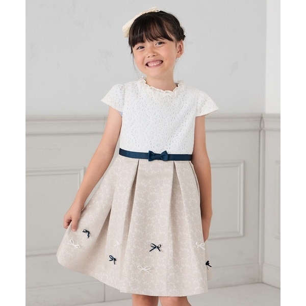 ・レースの身頃と高見えするジャガード生地のスカートの組み合わせが華やかなワンピース。