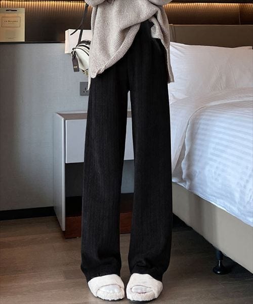 裏起毛ワイドパンツ あったかニットパンツ レディース ハイウエストイージーパンツ 裏ファーストレートパンツ厚手 暖かいロングパンツ 着やせ美脚脚長 韓国風ボトムス ウエストゴム楽ちん おしゃれ長ズボン黒 大人カジュアル秋冬