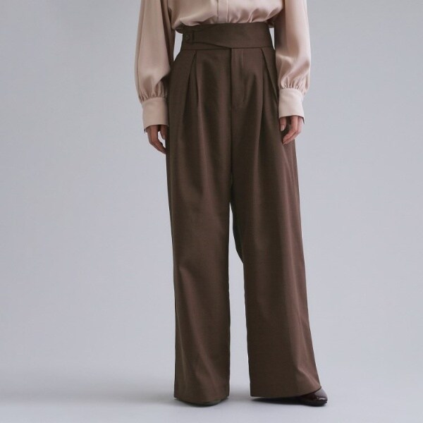 ハイウエストでタブデザインを特徴としたタックワイドパンツ