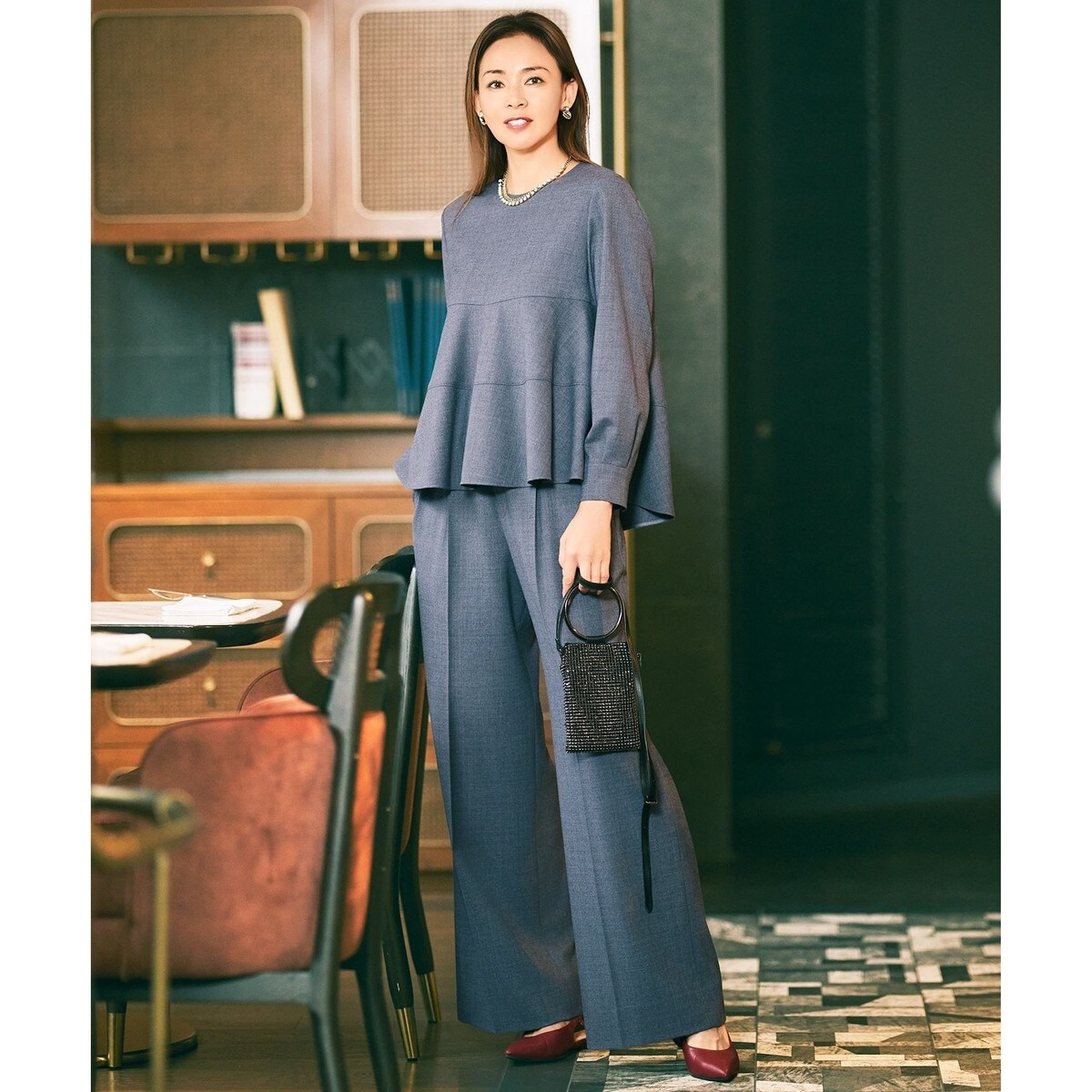すっきり見えが叶うデザインにこだわったワイドパンツ■デザイン2タックのワイドシルエットパンツです。脇側のタック奥にポケットが重なっており、すっきり見えるデザインになっています。後ろウエストはゴム仕様なので、快適に着て頂けます。■素材ウールの糸にストレッチ性のあるポリエステル糸を混紡しているサキソニー素材です。サキソニーならではのウォーム感と柔らかさ、コシのある風合いが特徴です。洗えて、シワが気になりにくいイージーケアウール素材です。■同素材アイテムペプラムブラウス(BLWRLS0004)