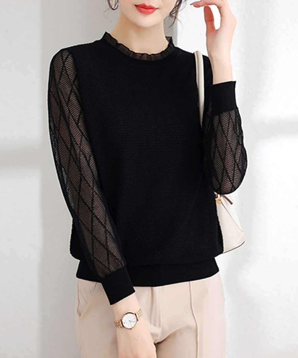 袖部分の異素材デザインがトレンド感のある、ラウンドネックのニットトップスです。