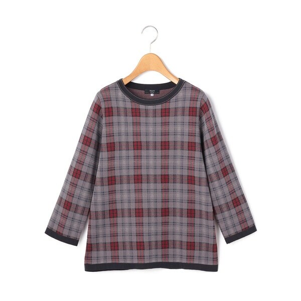 トラディショナルなチェック柄の7分袖ニットプルオーバー。襟ぐりや裾に配色をあしらうことで全体にメリハリを添えています。パンツともスカートともバランスよく着用でき、シンプルな無地ボトムを合わせるだけで印象的なコーディネートが楽しめる一着。滑らかさのある綿×ナイロン素材で肌触りも快適です。