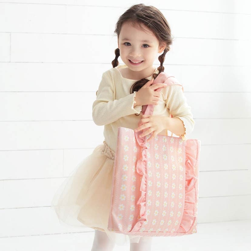 たくさん荷物が入るマチ付きバッグ。内側に大きめな仕切りと、ポケットがあり、荷物を整理して使えます。 フックにかけられるループ付き、お名前タグ付きです。大人が肩にかけやすい長めの持ち手もポイントです。 洗濯機でお手入れ可能。