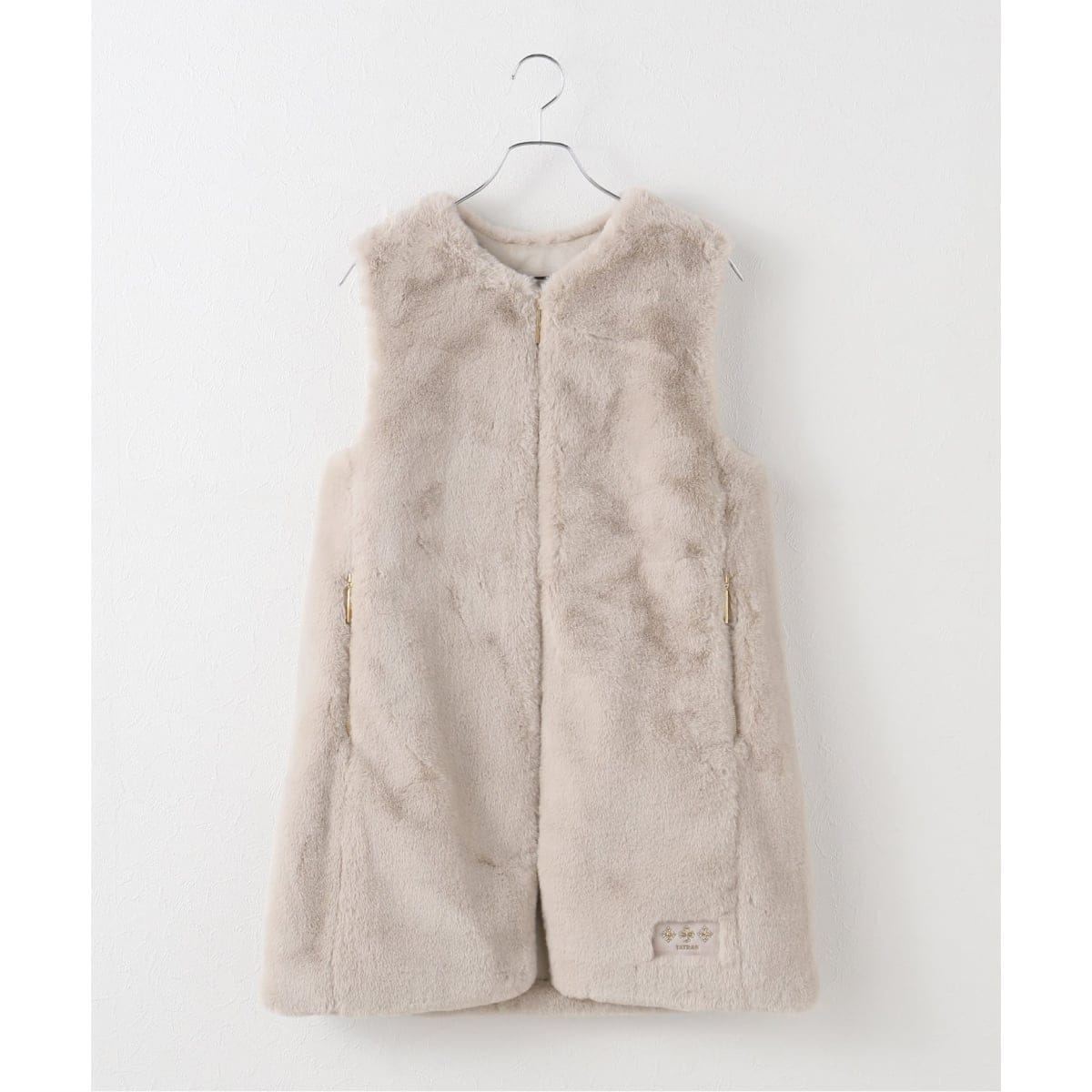 艶のある華やかなボア素材を使用したノーカラーロングベスト。