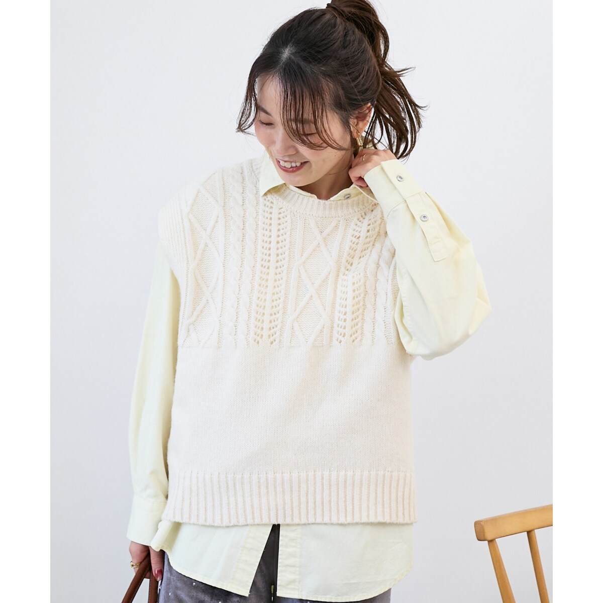 ウール混とスラブ糸を引きそろえ柄編みでアクセントを加えたニットベスト